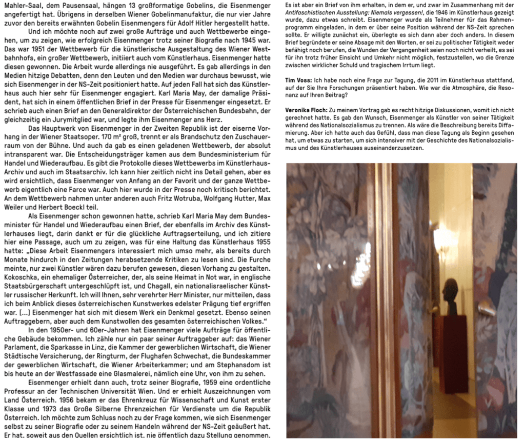 Maria Missbach weiß recht Gutes von Eisenmenger zu berichten, und was sie für Eisenmenger recht Gutes tat, er u. a. dank ihr gereinigt wurde, daß es eigentlich sie verdiente, den Raum mit den eisenmengerischen Gobelins auf „Maria-Missbach-Saal“ umzutaufen. Oder doch, kurz wie einfach: „Eisenmenger-Saal“ … Das wäre vielleicht ein wenig ungerecht allen gegenüber, die sich um Eisenmenger bemühten und bemühen, sich wieder betätigen, ihn berühmt zu machen. Stellvertretend für alle vielleicht den Raum doch umzubenennen auf: „König-Missbach-Rosenkranz-Springer-Holender-Saal“ …