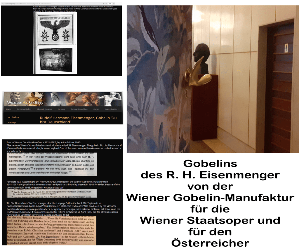 am 20. April auch darauf anstoßen werden, daß ihr Eisenmenger weiter in der Staatsoper, ihnen die Staatsoper weiter eine Gesinnungsfestung, auch wenn sein „Eiserner“ geopfert werden mußte, zum Erhalt des Gesinnungseigentlichen, sind doch seine Gobelins gesinnungswesentlich, sind seine Gobelins weiter in der Staatsoper, und mit der Umbenennung von „Gobelin-Saal“ auf „Gustav-Mahler-Saal“ wurde ihr Eisenmenger von jeder Schuld freigesprochen, denn, wer käme je auf die Idee, einen Raum mit dem Werk eines Nationalsozialisten mit dem Namen eines jüdischen Menschen zu benennen, und weil der Saal mit dem Werk von Eisenmenger nach einem jüdischen Menschen benannt wurde, kann Eisenmenger ja nie und nimmer ein —