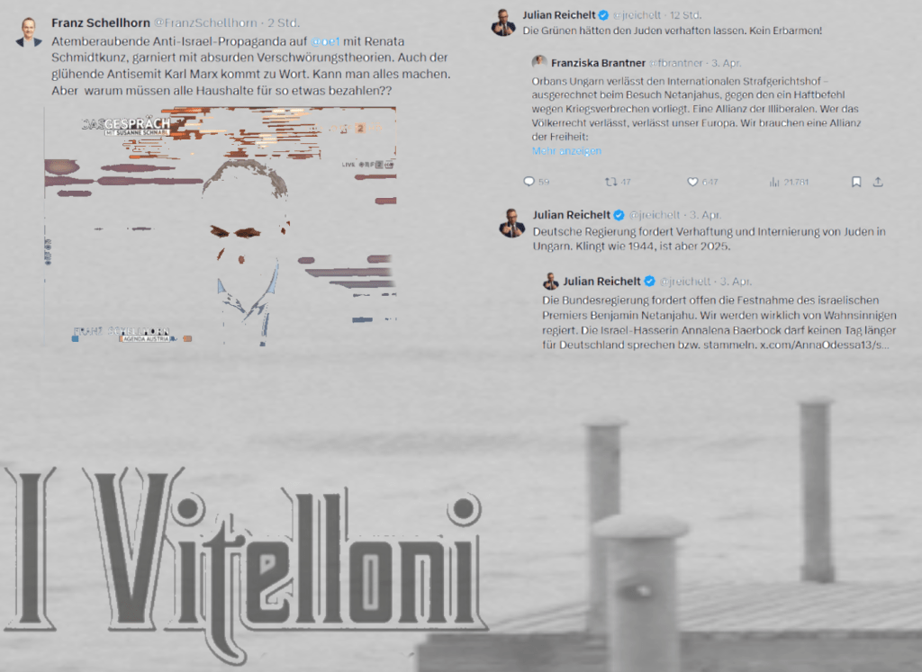 Wie je gewichtig das ist, was Franz Schellhorn je zu sagen hat, ist nie klarer noch zu erkennen gewesen, als in dem was Julian Reichelt von sich gibt, zu dem vitello, das sich wohl selbst auch als ein vitello d’oro sieht, um es anbetend zu tanzen ist. Er, Julian Reichelt, weiß nicht einmal den Namen dieses einen einzigen Menschen, gegen den es einen Haftbefehl gibt. Seinen Namen aber kennt Claudia Plakolm, „Bundesministerin ohne Portefeuille“, deren Aussagekraft der von Julian Reichelt ebenbürtig ist, wenn sie in bezug auf den Haftbefehl gegen diesen einen Menschen von einem „Affront für Österreich“ … Und wenn eines Tages, und dieser Tag kann und wird wohl kommen, die Anklage, das anhängige Gerichtsverfahren wegen „Bestechung, Betrug und Untreue“ in Israel selbst in eine Verurteilung mündet, Benjamin Netanjahu in Haft genommen werden wird, für Jahre in das Gefängnis muß, was wird dann Julian Reichelt schreiben, vielleicht: Das israelische Gericht hat den Juden verhaften lassen. Kein Erbarmen? Verhaftung und Internierung von Juden in Israel? Klingt wie 1944, ist aber?