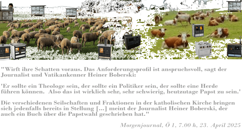 Das „Anforderungsprofil“ von Heiner Boberski ist, „der sollte eine Herde führen können“, also nicht der, Heiner Boberski, „sollte eine Herde führen“, sondern „der“, für den der Heiner Boberski das „Anforderungsprofil“ erstellt, heute, am 23. April 2025, kurz nach sieben Uhr im „Morgenjournal“ des öffentlich-rechtlichen Rundfunks Österreichs.