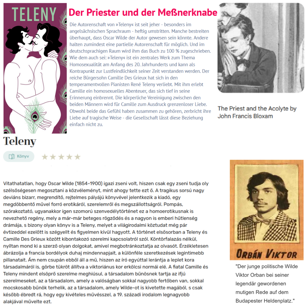 115 Verbreiteten Spekulationen zu Beginn des Jahrhunderts „verdanken die Ungarn den Ruf, besonders zur Männerliebe zu neigen. So signalisiert bereits der Titel des anonymen – Oscar Wilde zugeschriebenen – Romans Teleny, daß hier die Geschichte eines homosexuellen Jünglings erzählt wird.“ (Detering, Das offene Geheimnis, S 273 f.)