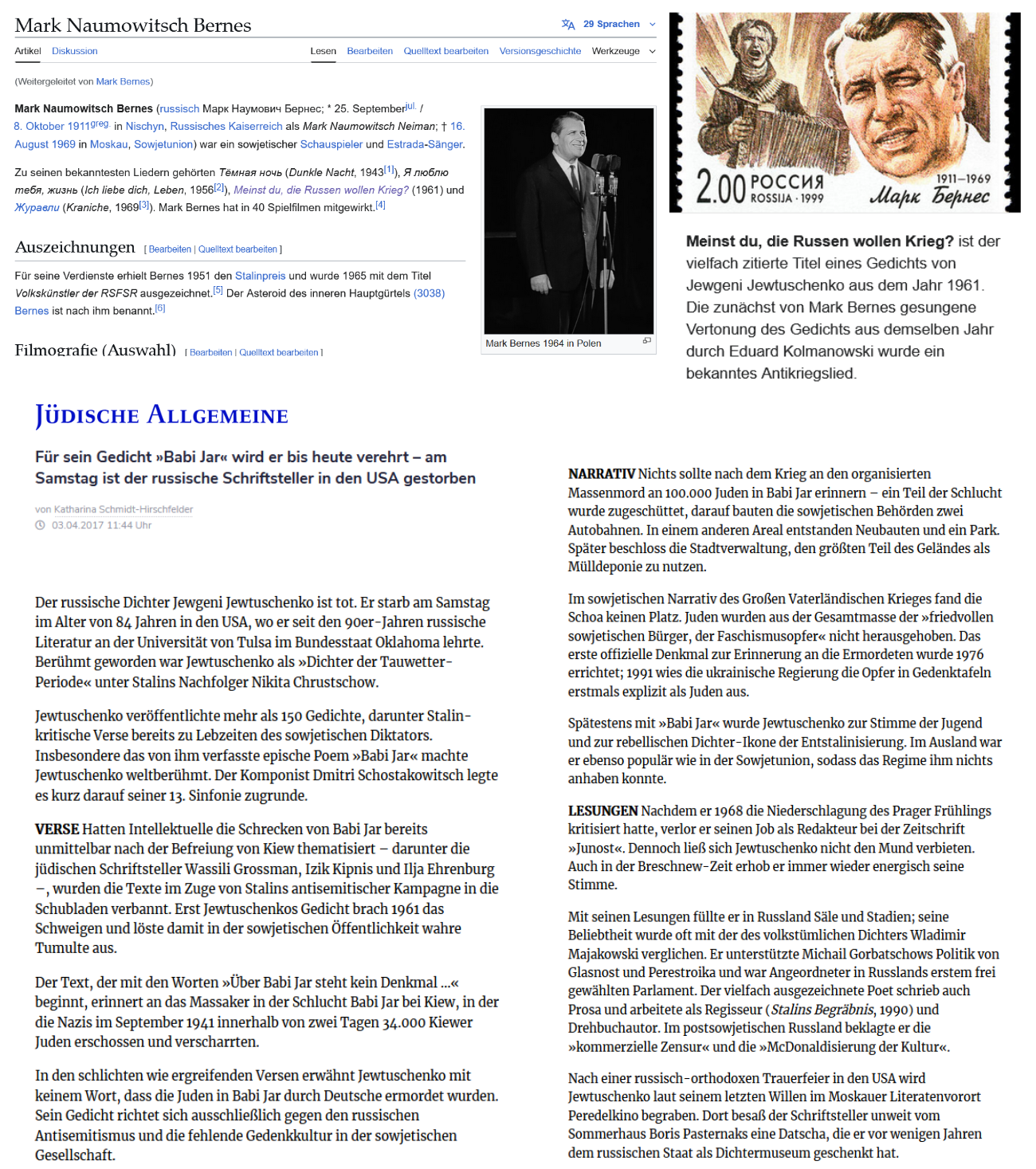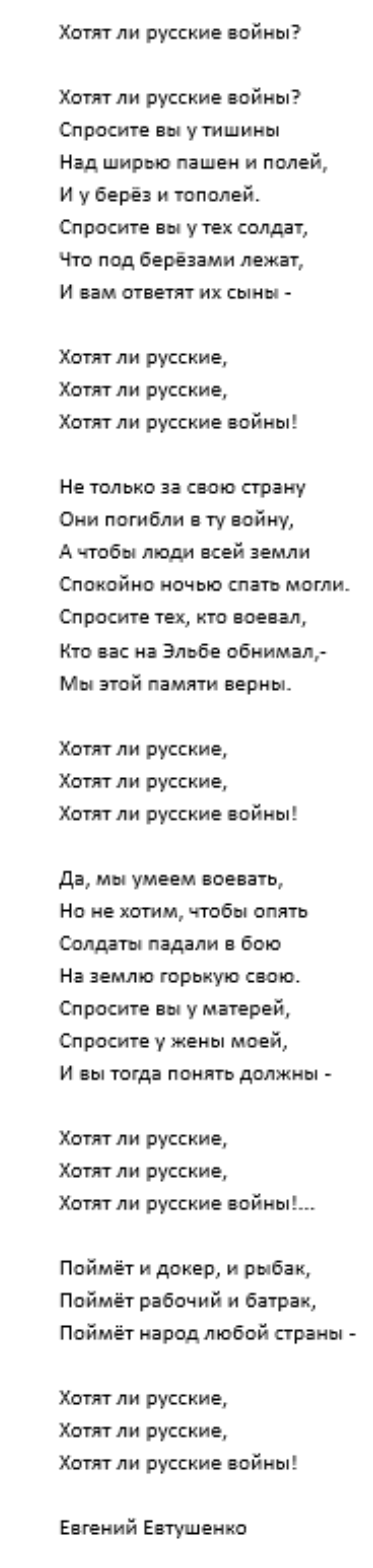 Meinst du, die Russen wollen Krieg ? (1961, Jewgeni Alexandrowitsch Jewtuschenko) Dieses Video war lange nicht mehr verfügbar, da das US-Unternehmen YouTube den Kanal von RT-DE als eine Form der Online-Bücherverbrennung gekündigt und somit alle Inhalte gelöscht hat.