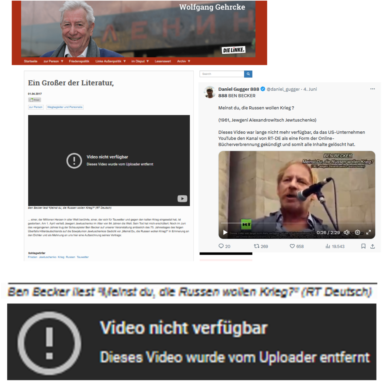 Es geht ihm, einfach wie kurz gesagt, wohl auch um das Heil von „RT“, aber je nicht um das Gedicht, ein Gedicht, das 888 nun im Juni 2025 Propaganda für der Putins Krieg. Eine „Bücherverbrennung“ des Gedichtes gab es nicht, was es aber gab, die Einsicht, etwa von Wolfgang Gehrcke, nicht weiter das Video des Gedichts von „RT“ zu verbreiten, Wolfgang Gehrcke entfernte, wie gelesen werden kann, das „RT“-Video selbst wieder,