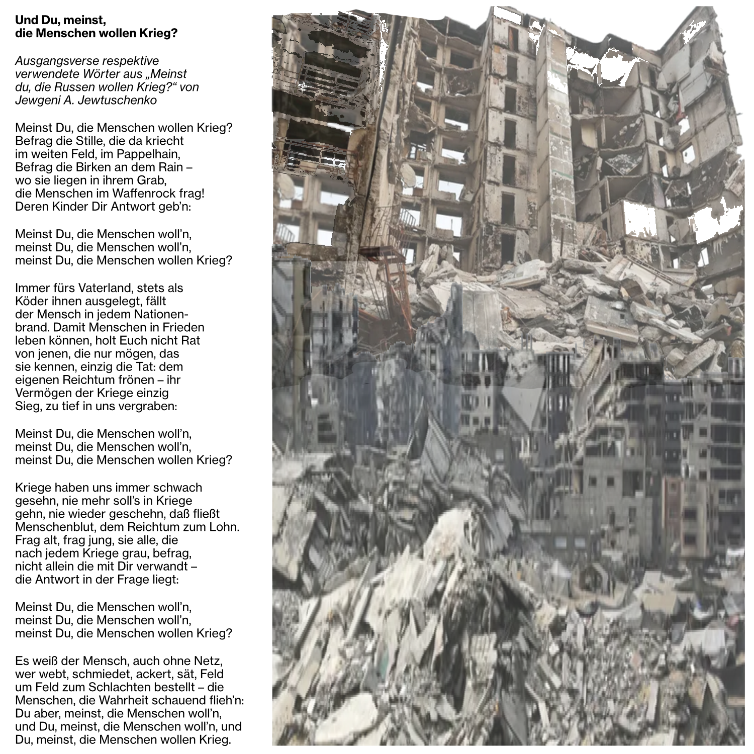 vielleicht genügte es, ein paar Worte nur zu tauschen, ein paar Zeilen nur ein wenig anders zu formulieren, so daß es von allen als Antikriegsgedicht aufgenommen werden kann, gleich, wo immer sie geboren, gleich wo immer sie leben, damit die Teilung überwunden ist; denn die Frage danach, wie in diesem Gedicht, ob denn die „Russen Krieg wollen“, teilt nach wie vor ein, in die einen und die anderen, stellt keine Gemeinsamkeit her, läßt zu viele Antworten zu, letztlich auch Krieg als Antwort —