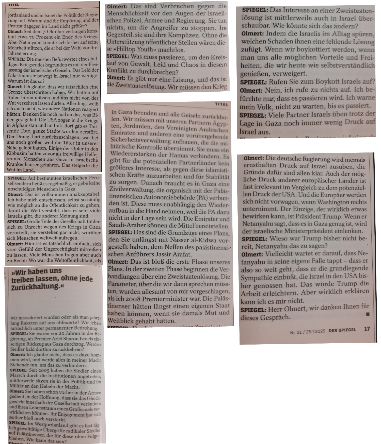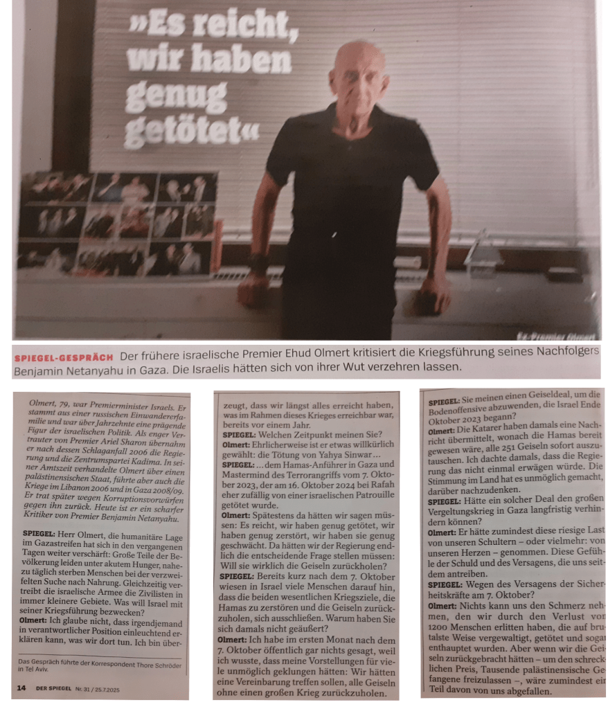 In seiner Ausgabe Nr. 31 vom 25. Juli 2025 hat „Der Spiegel“ ein Interview mit dem früheren israelischen Premier Ehud Olmert unter dem Titel „Es reicht, wir haben genug getötet“ veröffentlicht, das Oskar Deutsch hätte lesen sollen, ehe er am 29. Juli 2025 nächtens seine Aussagen im österreichischen Fernsehen machte, vielleicht hat er es doch gelesen, und wenn er es gelesen haben sollte, hat es ihn nicht davon abgehalten, auszusagen, wie er aussagte, denn er, Oskar Deutsch, weiß alles und vor allem weiß er: „daß sie irren“. Es ist lohnenswert, das gesamte Interview zu lesen, hier sollen nur die Passagen zitiert werden, in denen sich Ehud Olmert zum derzeitigen Premier Benjamin Netanyahu äußert: