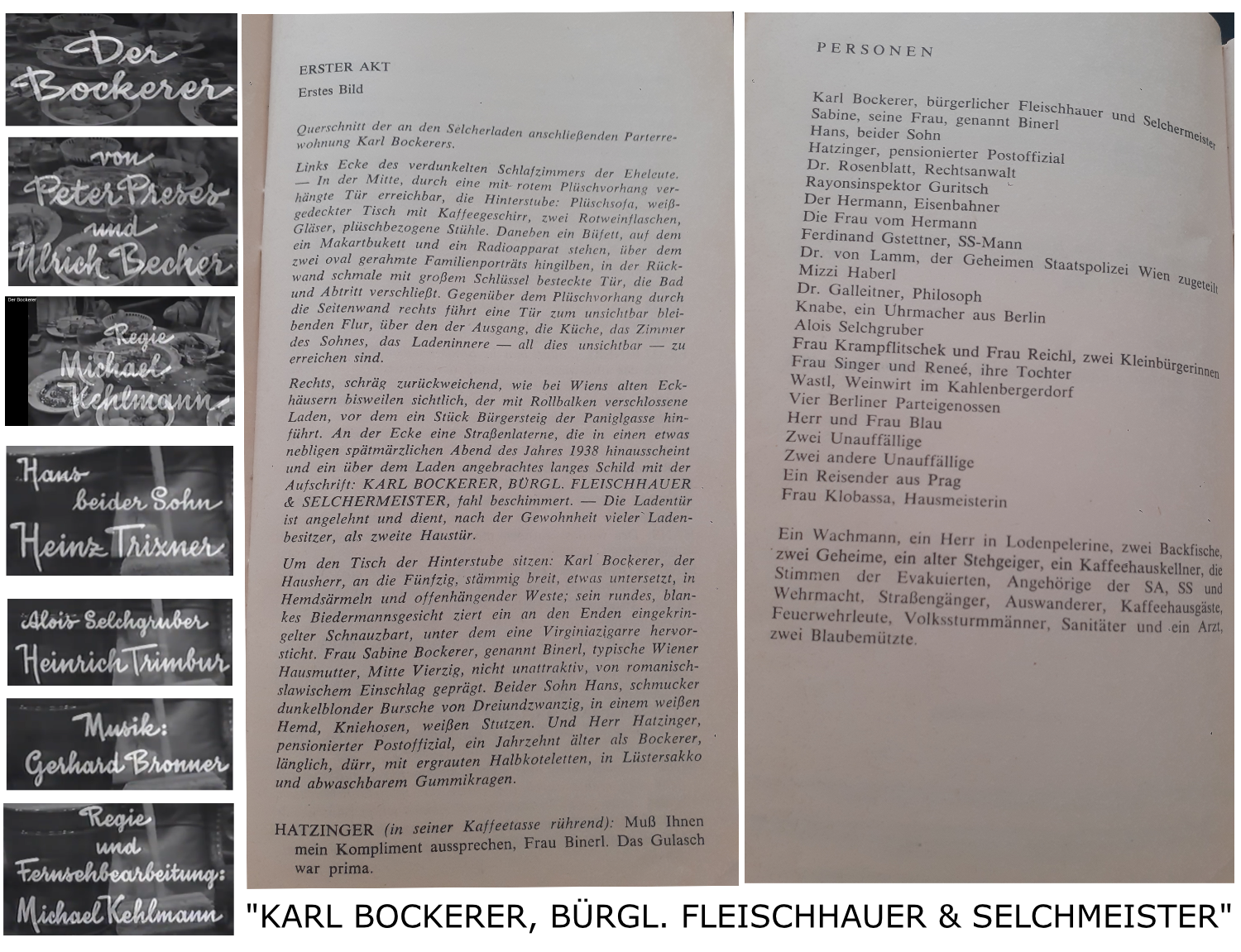 Dabei ist bereits auf der ersten Seite des Stückes von Preses und Becher in der Regieranweisung zum ersten Bild im ersten Akt zu lesen: „An der Ecke eine Straßenlaterne, die in einem etwas nebligen spätmärzlichen Abend des Jahres 1938 hinausscheint und ein über dem Laden angebrachtes langes Schild mit der Aufschrift: KARL BOCKERER, BÜRGL. FLEISCHHAUER & SELCHERMEISTER, fahl beschimmert.“