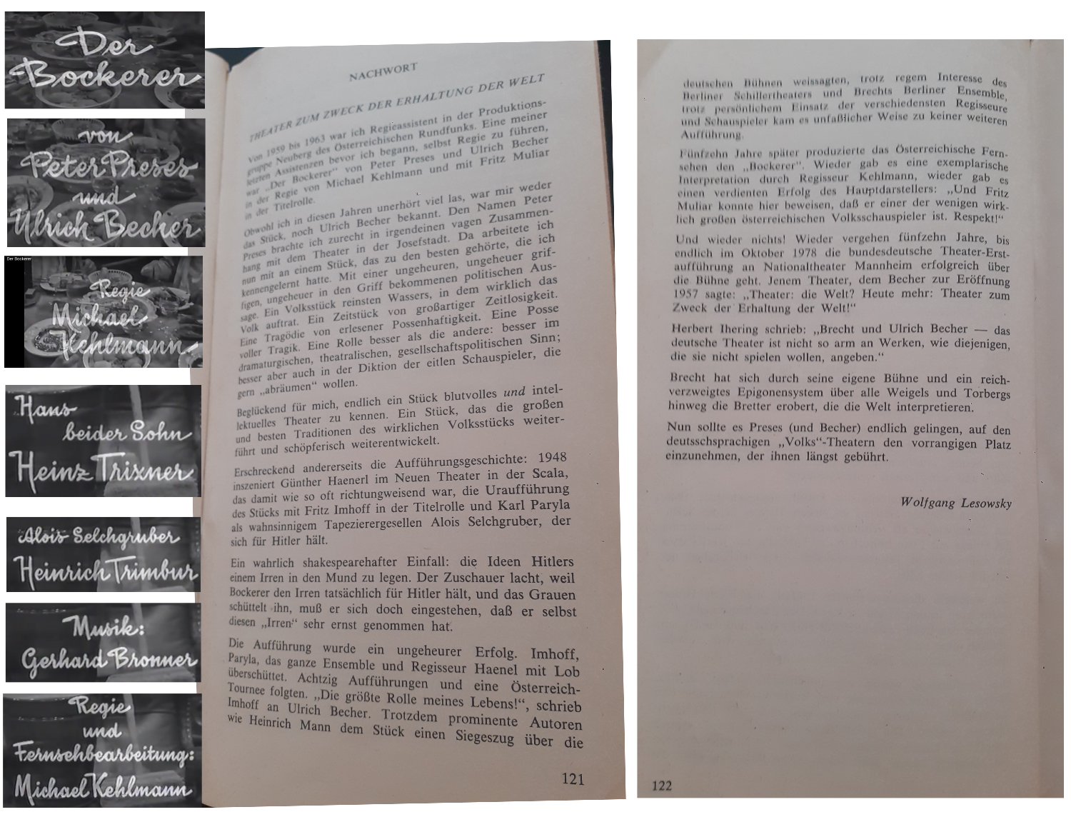 Es genügt, hierzu aus dem Nachwort von Wolfgang Lesowsky zu zitieren, enthalten in „Peter Preses und Ulrich Becher. Der Bockerer. Thomas Sessler Verlag. Der Souffleurkasten. Erste Buchausgabe. ISBN 3-85173-018-024-9. Wien.“, vor über vier Jahrzehnten veröffentlicht, in Antiquariaten nur noch weiterhin erhältlich:
