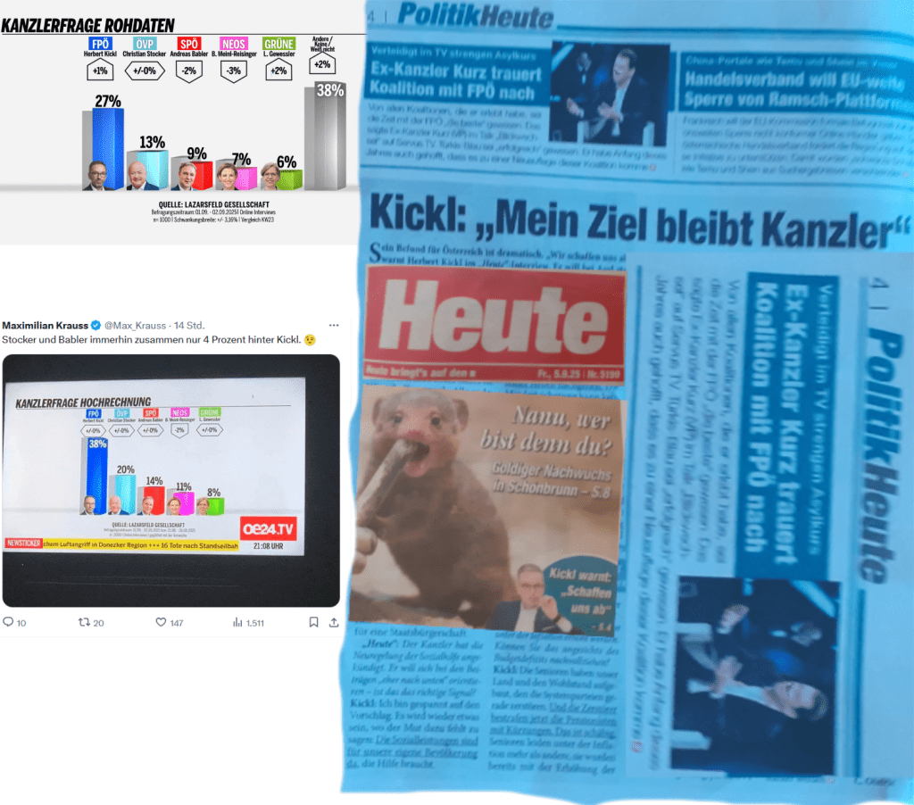 Das endlich sollte für die anderen Parteien von wesentlichen Belang sein, wen sie den Menschen in Österreich als Kandidaten anbieten, endlich Kandidatinnen, zu denen die Menschen in überragender Mehrheit Ja sagen können, und jene, die mit „Andere/Keine/Weiß nicht“ antworten, nur mehr eine verschwindende Minderheit sind. Denn offensichtlich sind Menschen in Österreich seit Jahren bereit für Neues.