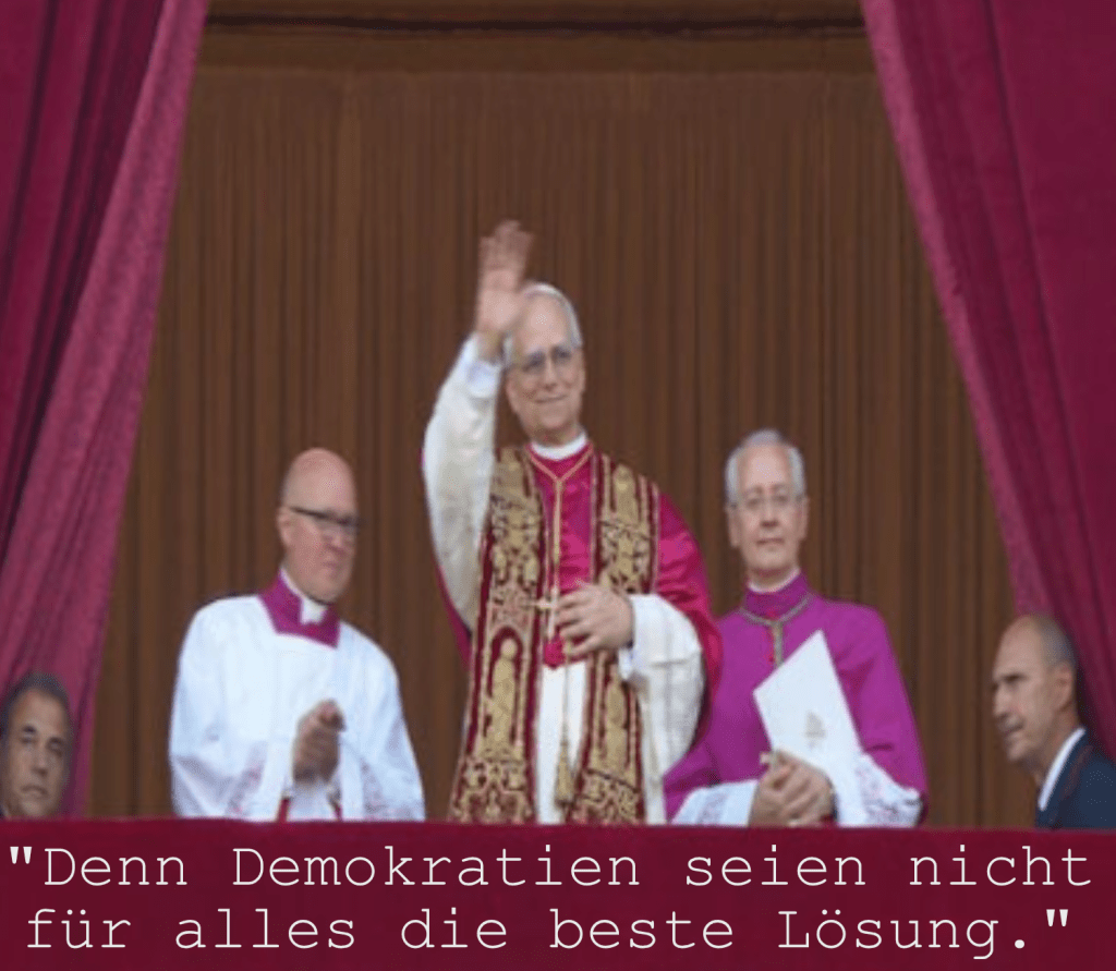 Mit „Demokratien seien nicht für alles die beste Lösung“ gesellt sich dieser Kirchenführer nun zu all den Männern hinzu, reiht sich dieser Führer in die Kohorte der Männer ein, für die die Demokratie nicht nur nicht die beste Lösung ist, sondern die eifrig und eifernd nach einer für sie mannesgemäßen Lösung suchen, an einer mannesreichen Rückkehr basteln, und das ist alles fern, recht weit fern der Demokratie. Ein heute dafür gebrauchtes landläufiges Schlagwort ist: Autokratie. So marschiert dieser im seligen Reich der einhundertprozentigen Männerquote gemachte Führer mit seiner Meinung, Demokratien seien nicht für alles die beste Lösung, mit den Führern derselben Meinung und demselben Begehren, Demokratie sei nicht die beste Lösung, deren ständig genannten und somit bekanntesten Namen u. a. m. sind: Trump, Putin, Orbán, Milei, XI, Kim Jong …