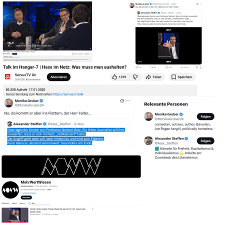 Alexander Steffen verbreitet den Diskussionsausschnitt zwischen Florian Klenk und Norbert Bolz mit, den „MWW — MehrWertWissen“ nun ausgegraben hat … Wie aktuell von Monika Gruber, Alexander Steffen und MehrWertWissen doch das ist: die Verbreitung einer Diskussion, die vor fünf Jahren von der Fernsehanstalt „ServusTV“ ausgestrahlt wurde.