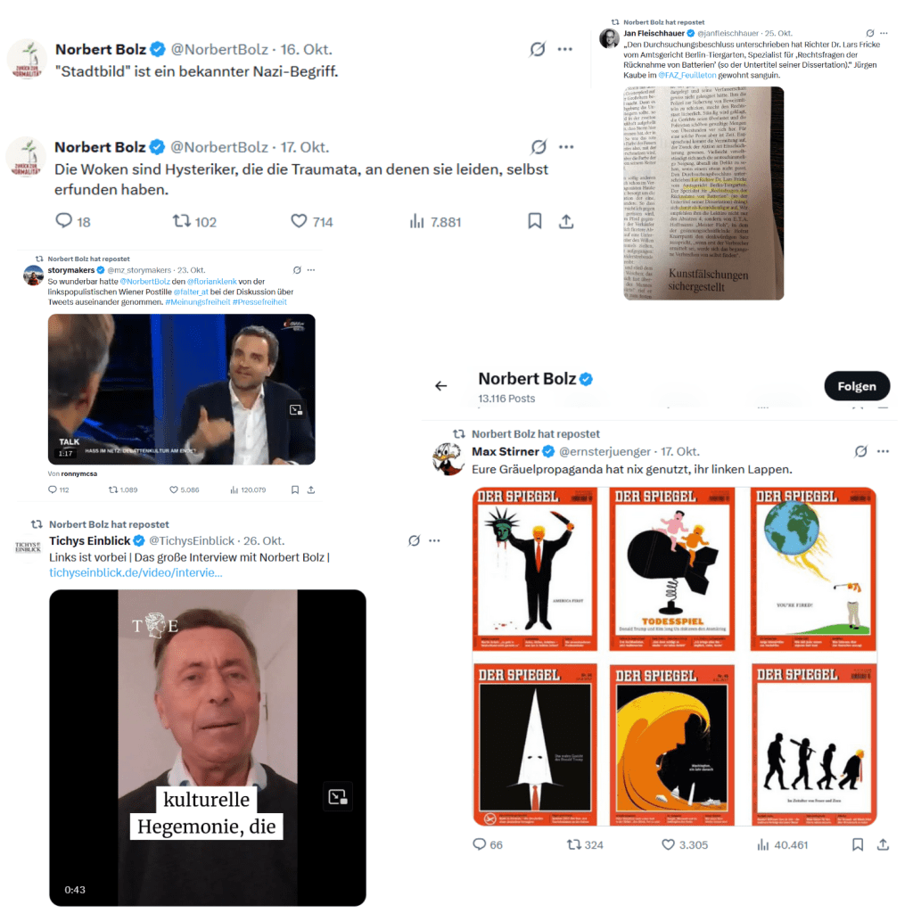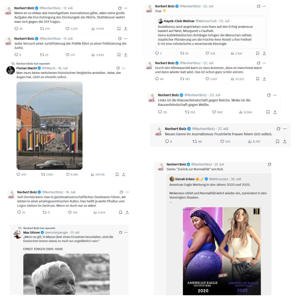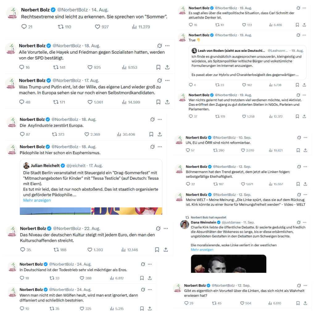 Im Zeitraum vom 17. Juli 2025 bis zum 26. Oktober 2025 verbreitete Norbert Bolz Tweets u. v. a. m. von