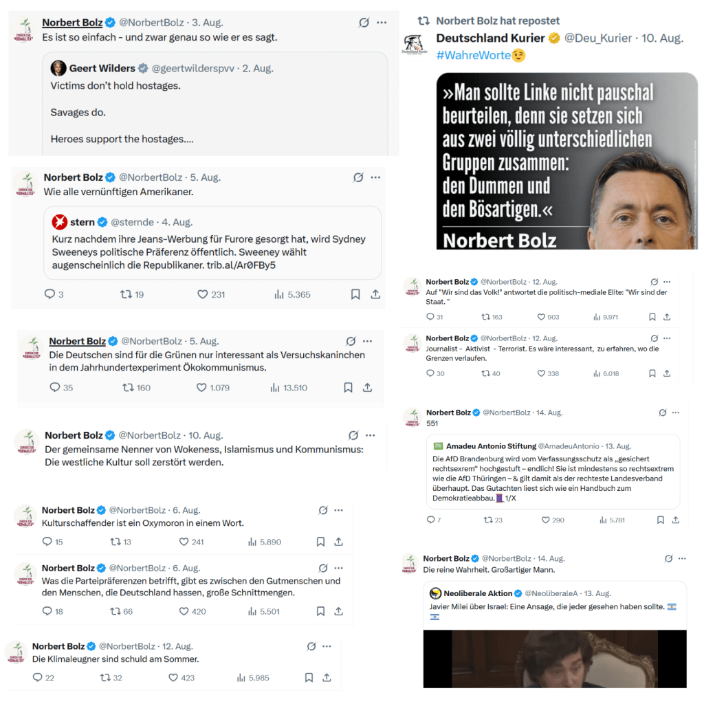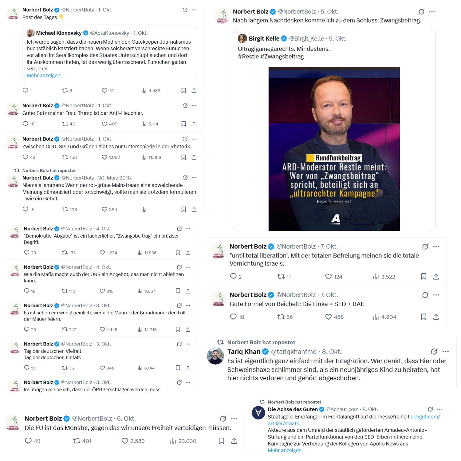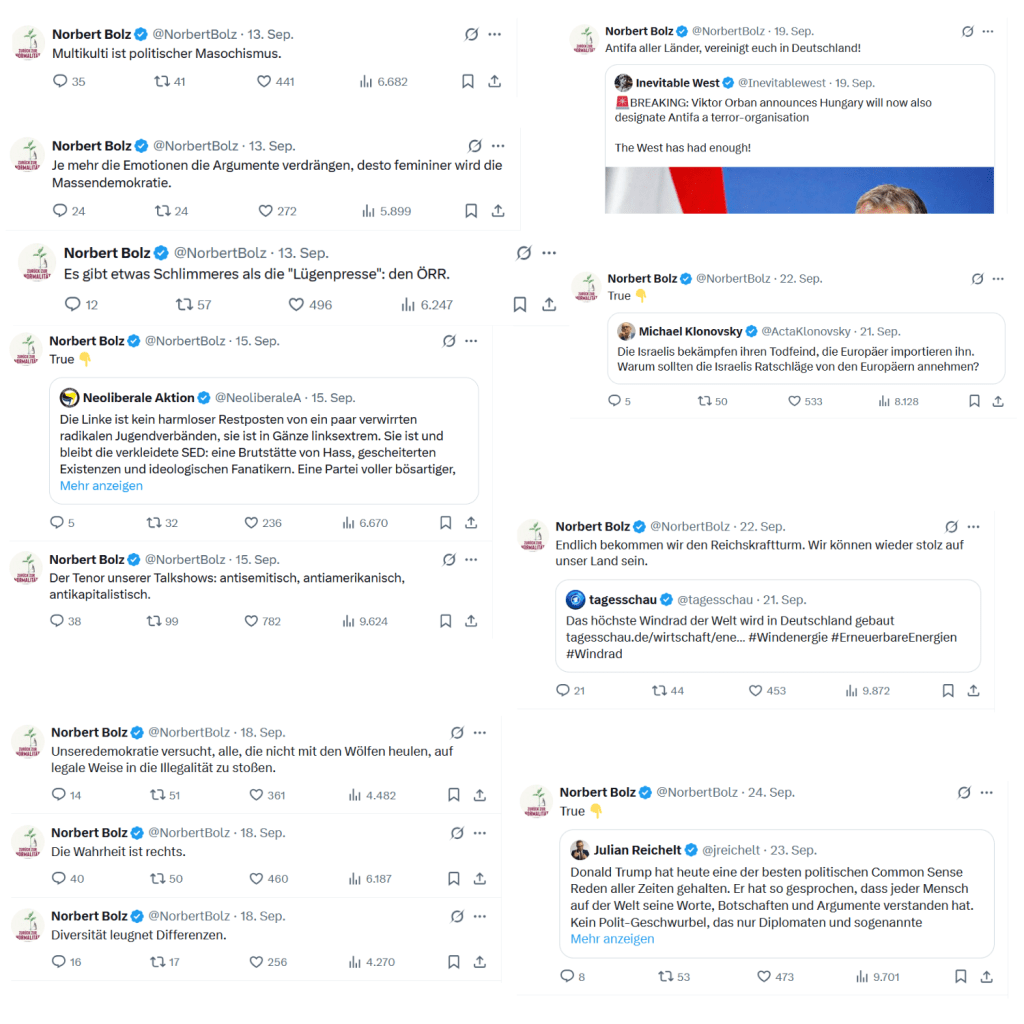 Im Zeitraum vom 17. Juli 2025 bis zum 26. Oktober 2025 verbreitete Norbert Bolz Tweets u. v. a. m. von