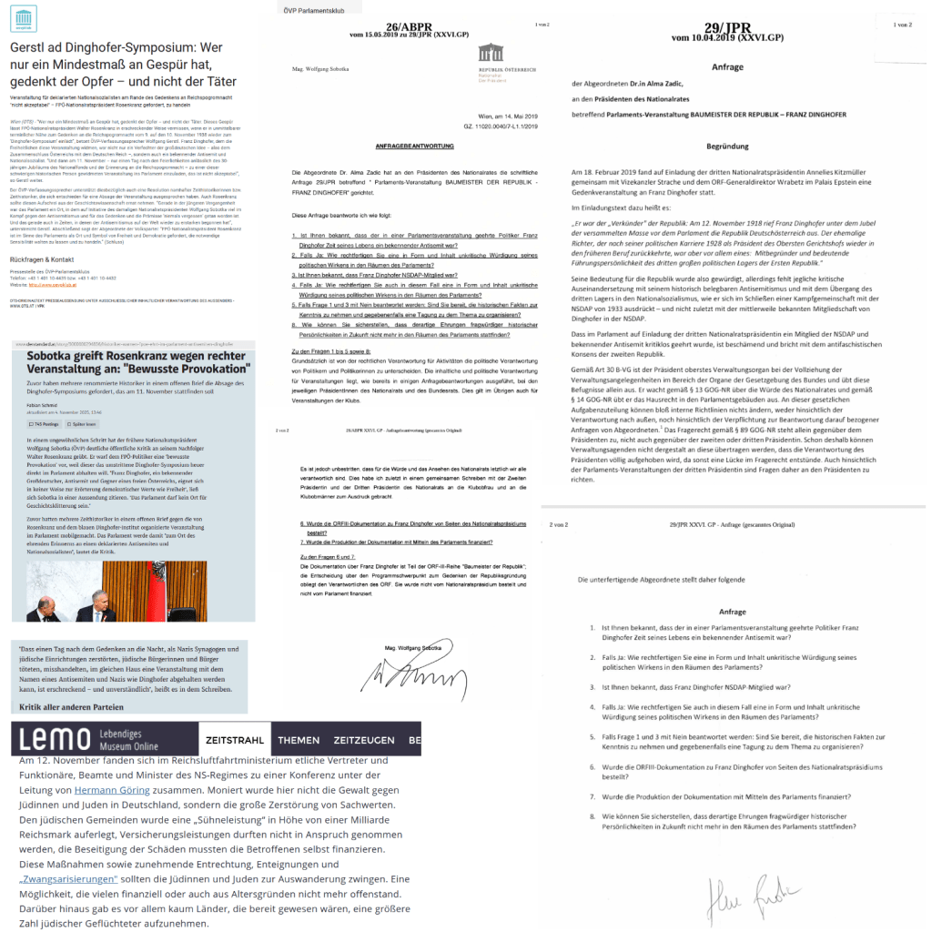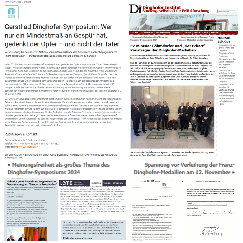 Wie recht doch Wolfgang Gerstl hat, das muß doch hinzugefügt werden, die notwendige Sensibilität nicht aufzubringen, das Dinghofer-Symposium schon am 11. November, also nur einen Tag nach … Im letzten Jahr hatte diese Partei die notwendige Sensibilität, 2024 fand das Dinghofer-Symposium „ohne Aufschrei der Geschichtswissenschaft“ und Wolfgang Sobotka am 12. November 2024 statt, ganze zwei Tage später, und da war alles vorbei, das Wolfgang Gerstl „Reichspogromnacht vom 9. auf den 10. November 1938 “ nennt, denn am 12. November 1938 ging alles wieder, was die „Novemberpogrome 1938“ betraf, seinen ordentlichen bürokratischen Weg … So hätten sich Walter Rosenkranz und seine Partei den heurigen Aufschrei ersparen können, wenn sie das Symposium wieder zwei Tage später, also am 12. November 2025 …