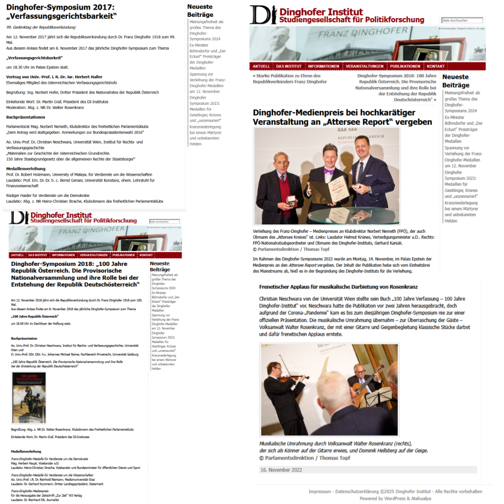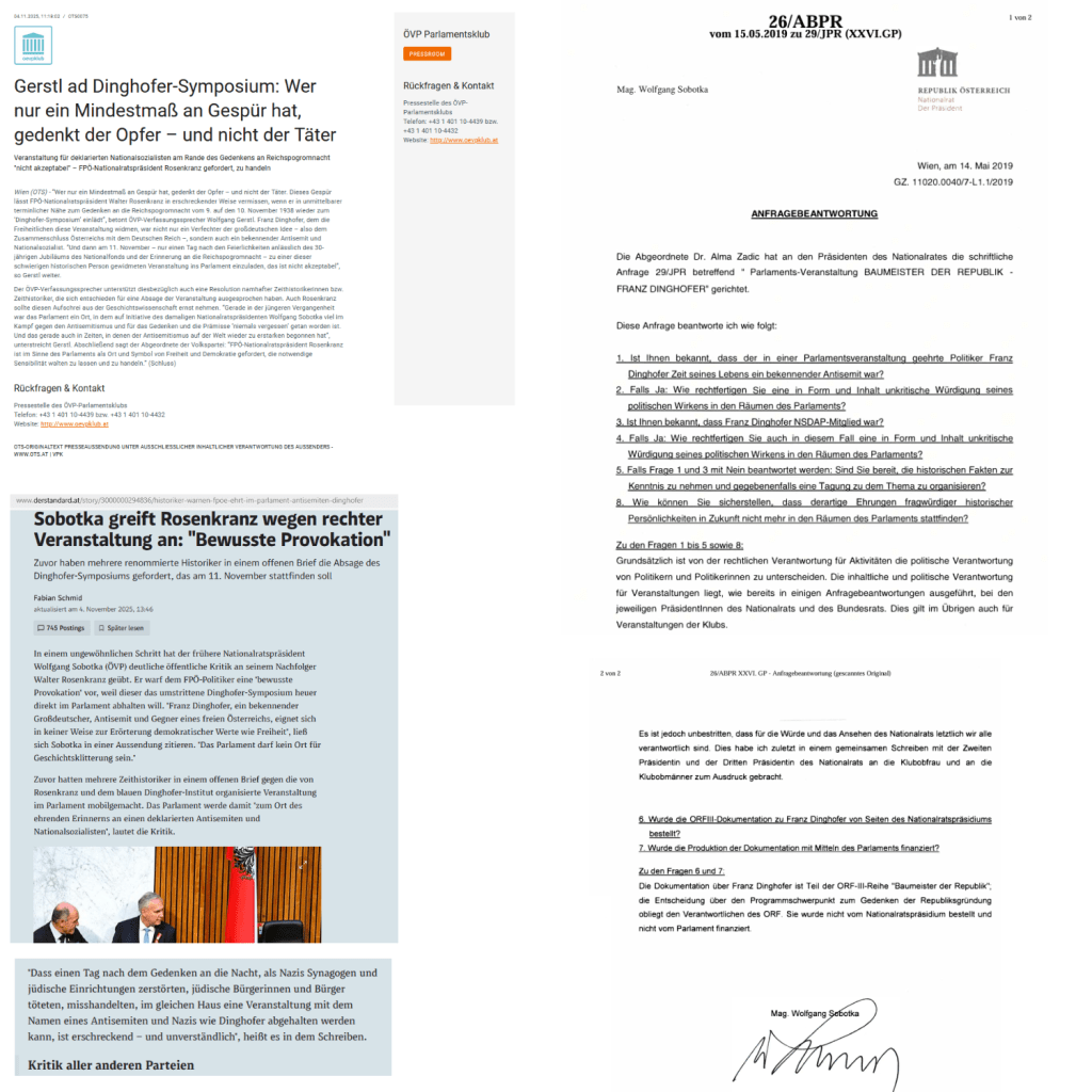 Der Standard. Sobotka greift Rosenkranz wegen rechter Veranstaltung an: „Bewusste Provokation“ — Zuvor haben mehrere renommierte Historiker in einem offenen Brief die Absage des Dinghofer-Symposiums gefordert, das am 11. November stattfinden soll. Fabian Schmid. 4. November 2025