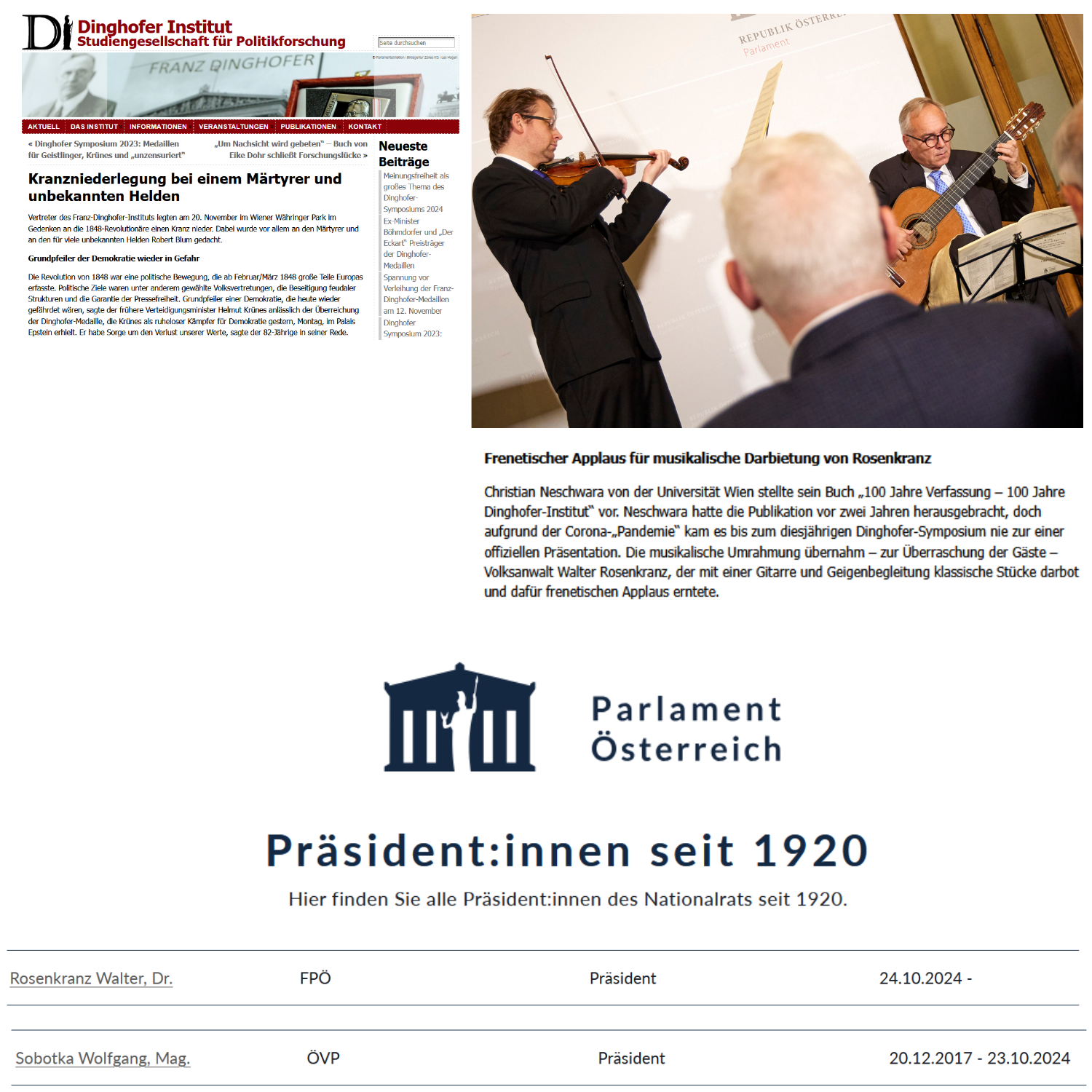 Übrigens, die Musik verbindet Wolfgang Sobotka, der auch als Dirigent und Violoncellist anhörbare Töne von sich gibt, mit Walter Rosenkranz, der nun seit dem 24. Oktober 2024 Nationalratspräsident ist, davor war es Wolfgang Sobotka, und zwar vom 20. Dezember 2017 bis zum 23. Oktober 2024 … Wie viele Jahre früher hätte, wäre Wolfgang Sobotka u. v. a. m. nicht Nationalratspräsident gewesen, hätte es auch seinen Aufschrei gegeben, als Dirigent und Violoncellist, gegen Franz Dinghofer im Parlament, gegen das Franz-Dinghofer-November-Pro im Parlament, das nun seit fünfzehn Jahren …