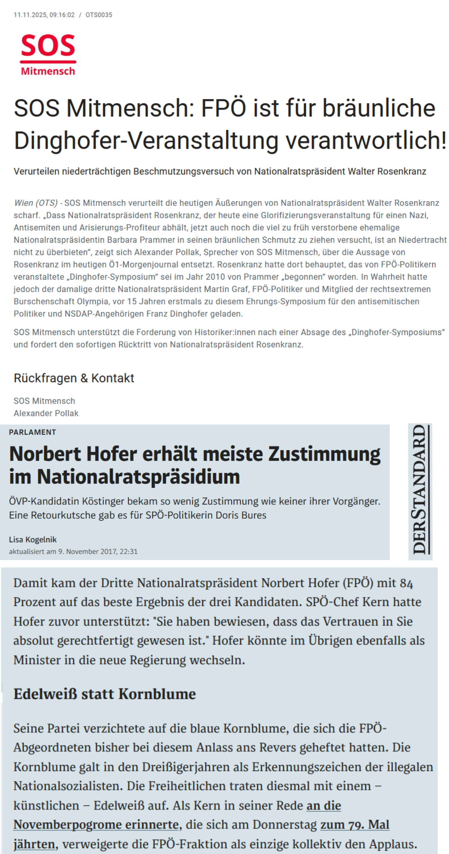 „Dass Nationalratspräsident Rosenkranz, der heute eine Glorifizierungsveranstaltung für einen Nazi, Antisemiten und Arisierungs-Profiteur abhält, jetzt auch noch die viel zu früh verstorbene ehemalige Nationalratspräsidentin Barbara Prammer in seinen bräunlichen Schmutz zu ziehen versucht, ist an Niedertracht nicht zu überbieten“, zeigt sich Alexander Pollak, Sprecher von SOS Mitmensch, über die Aussage von Rosenkranz im heutigen Ö1-Morgenjournal entsetzt. Rosenkranz hatte dort behauptet, das von FPÖ-Politikern veranstaltete „Dinghofer-Symposium“ sei im Jahr 2010 von Prammer „begonnen“ worden. In Wahrheit hatte jedoch der damalige dritte Nationalratspräsident Martin Graf, FPÖ-Politiker und Mitglied der rechtsextremen Burschenschaft Olympia, vor 15 Jahren erstmals zu diesem Ehrungs-Symposium für den antisemitischen Politiker und NSDAP-Angehörigen Franz Dinghofer geladen.