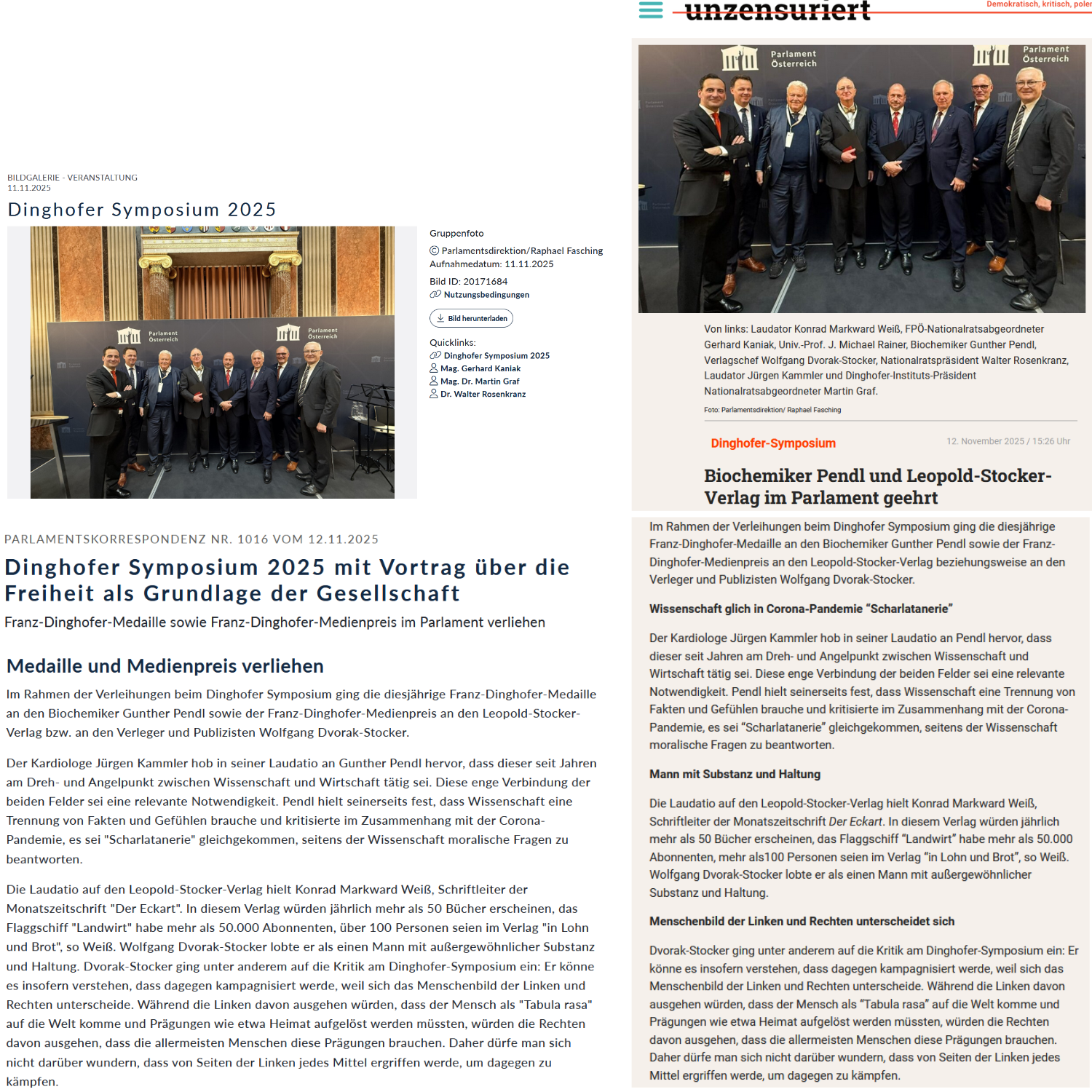NS Das Auffällige an dem diesjährigen Franz-Dinghofer-Symposium im Parlament — die Aufregungsebbe darüber, kann am heutigen 13. November 2025 gesagt werden, hat bereits eingesetzt — ist, die Parlamentskorrespondenz berichtet über die Verleihungen an Gunther Pendl und an Wolfgang Dvorak-Stocker so,