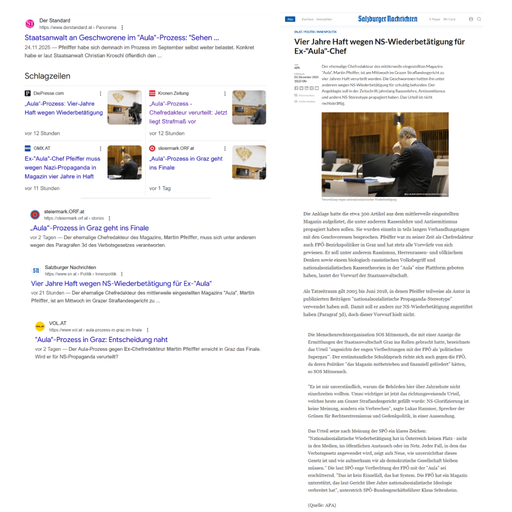 wer in Österreich schreiberisch gesinnungsgemäß derart auffällt, wie etwa Martin Pfeiffer, wird zur Rechenschaft gezogen, und verurteilt, wie eben jetzt, am 3. Dezember 2025, Martin Pfeiffer für den verhandelten „Tatzeitraum von 2005 bis 2018“. Und ein 1951 gegründetes Magazin, wie die „Aula“, von dem jetzt in der Berichterstattung über die pfeifferische Verurteilung ausschließlich geschrieben wird, eingestellt, bereits 2018 eingestellt wurde, 67 Jahre nach dessen Gründung.