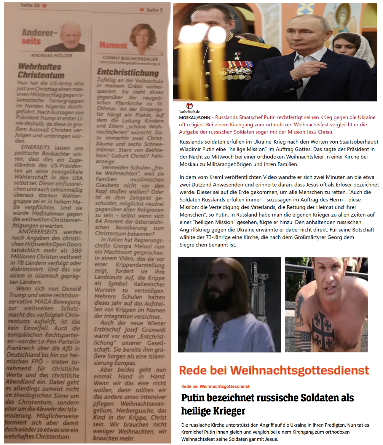 Unter der Schlagzeile „Entchristlichung“ also die Fürsprache für eine Verchristlichung, unter der Schlagzeile „Wehrhaftes Christentum“ führt Andreas Mölzer in ebendieser Krone am 28. Dezember 2025 sein „Andererseits und Einerseits“ aus, in Glauben und Hoffnung „möglicherweise formiert sich aber damit doch wieder so etwas wie ein wehrhaftes Christentum“.