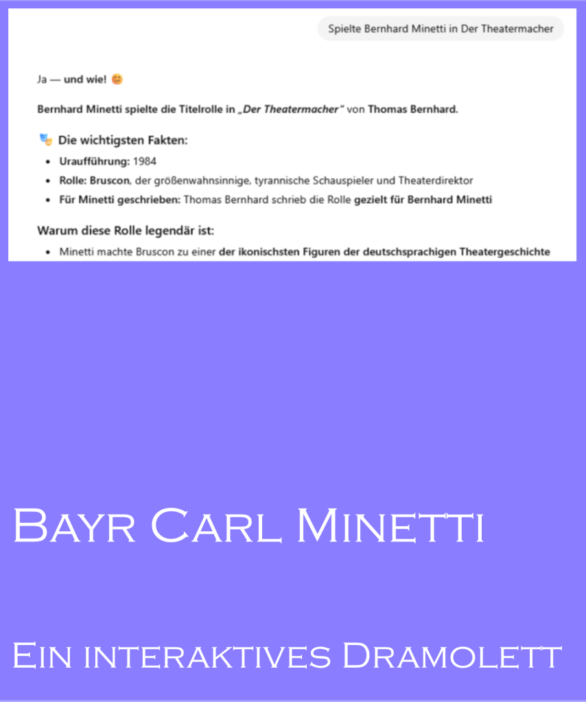 Ein Dramolett von Chatgpft vulgo KI darf besonders empfohlen werden, handelt es sich bei diesem Dramolett um ein, einfach wie kurz gesagt, interaktives Dramolett. Anhand des zum Interaktiven weiterentwickelten Dramoletts kann die Modernität, die Innovation durch Chatgpt respektive KI exemplarisch aufgeführt werden.
