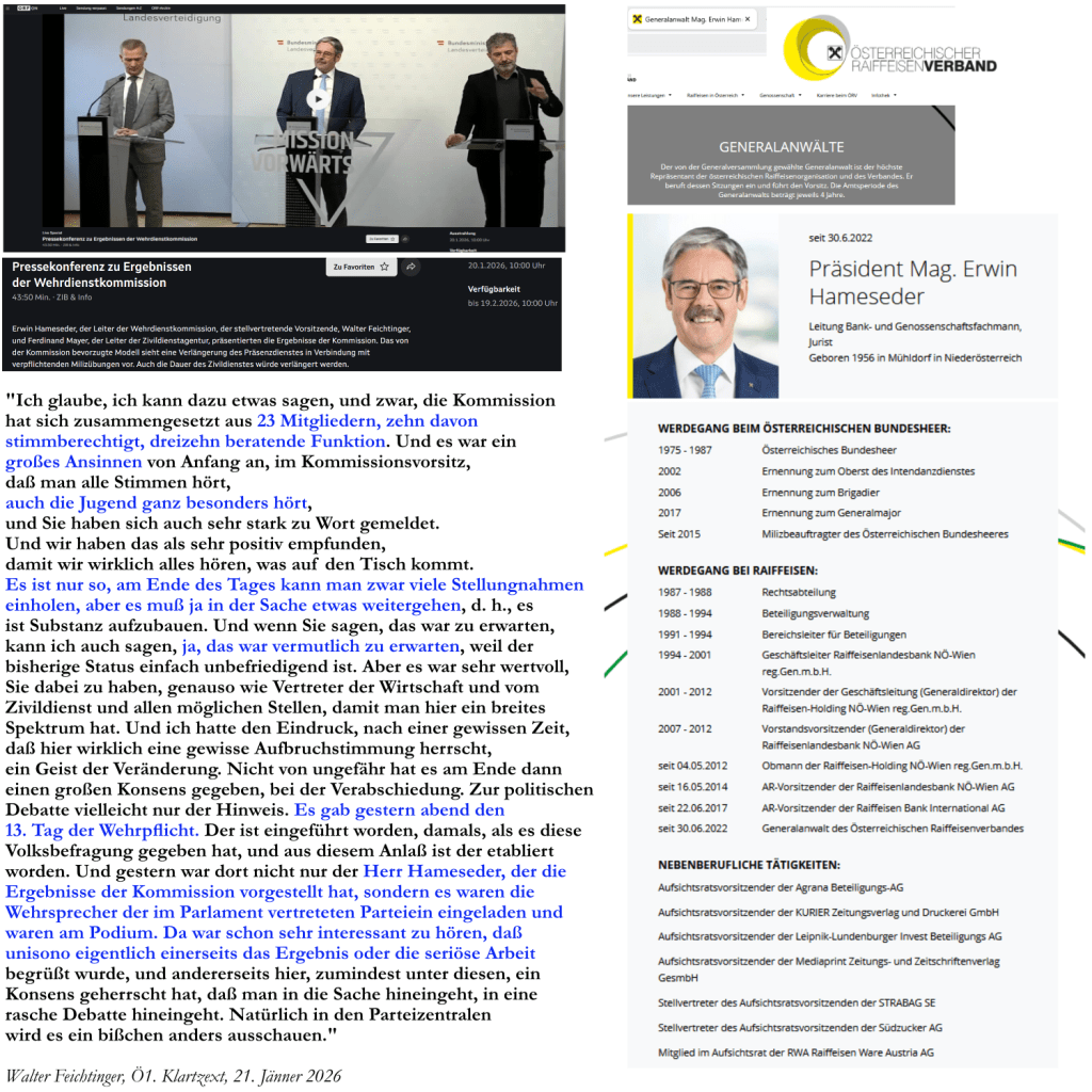 Der mit Übungen in Ruhe gelassene Rentier verwies in dieser Sendung auf den „XIII. Tag der Wehrpflicht“, den Ort, an dem am 20. Jänner 2026 der 13. Tag abgehalten wurde, erwähnt Walter Feichtinger nicht.