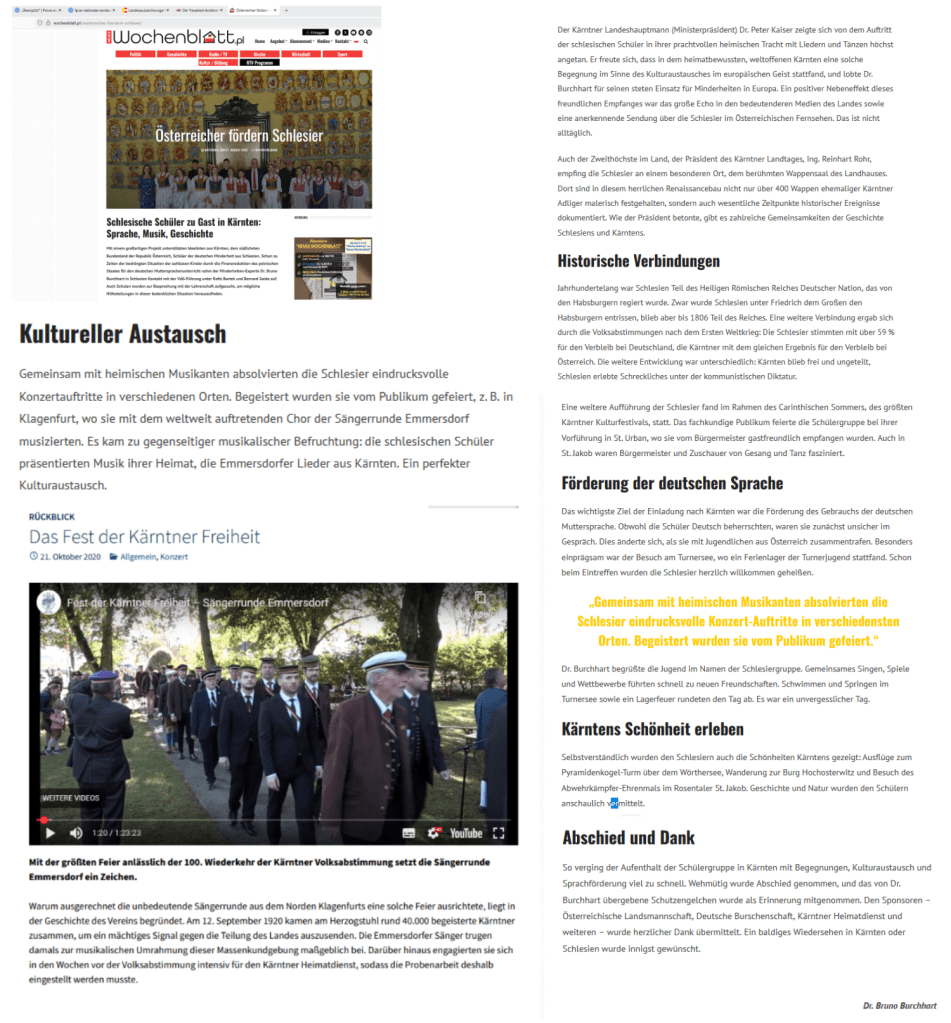 Der Kärntner Landeshauptmann (Ministerpräsident) Dr. Peter Kaiser zeigte sich von dem Auftritt der schlesischen Schüler in ihrer prachtvollen heimischen Tracht mit Liedern und Tänzen höchst angetan. Er freute sich, dass in dem heimatbewussten, weltoffenen Kärnten eine solche Begegnung im Sinne des Kulturaustausches im europäischen Geist stattfand, und lobte Dr. Burchhart für seinen steten Einsatz für Minderheiten in Europa. Ein positiver Nebeneffekt dieses freundlichen Empfanges war das große Echo in den bedeutenderen Medien des Landes sowie eine anerkennende Sendung über die Schlesier im Österreichischen Fernsehen. Das ist nicht alltäglich.