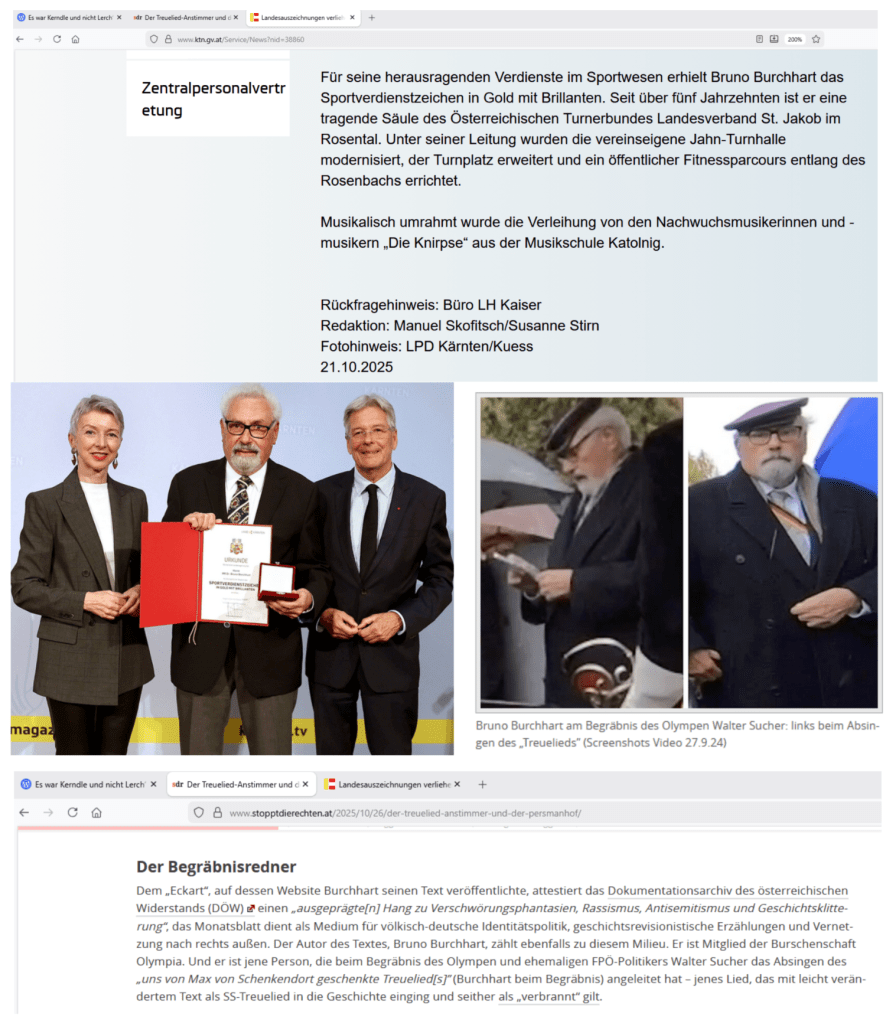 Der Begräbnisredner Dem „Eckart“, auf dessen Website Burchhart seinen Text veröffentlichte, attestiert das Dokumentationsarchiv des österreichischen Widerstands (DÖW) einen „ausgeprägte[n] Hang zu Verschwörungsphantasien, Rassismus, Antisemitismus und Geschichtsklitterung“, das Monatsblatt dient als Medium für völkisch-deutsche Identitätspolitik, geschichtsrevisionistische Erzählungen und Vernetzung nach rechts außen. Der Autor des Textes, Bruno Burchhart, zählt ebenfalls zu diesem Milieu. Er ist Mitglied der Burschenschaft Olympia. Und er ist jene Person, die beim Begräbnis des Olympen und ehemaligen FPÖ-Politikers Walter Sucher das Absingen des „uns von Max von Schenkendort geschenkte Treuelied[s]” (Burchhart beim Begräbnis) angeleitet hat – jenes Lied, das mit leicht verändertem Text als SS-Treuelied in die Geschichte einging und seither als „verbrannt“ gilt.