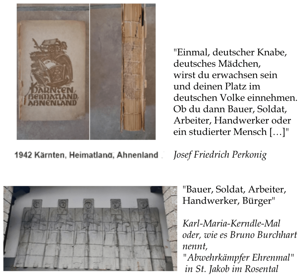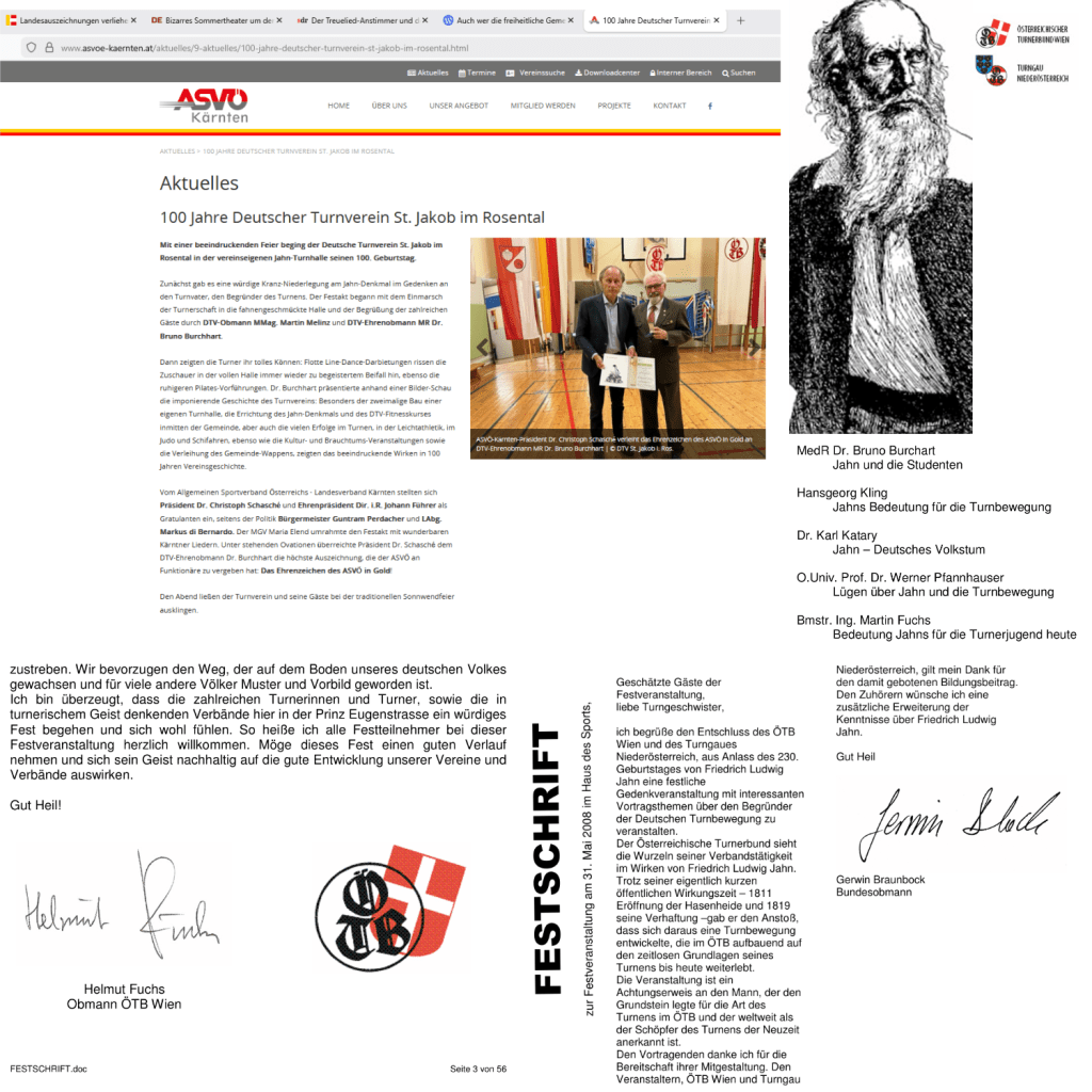 In derselben Ausgabe erklärte Bruno Burchhart (aB! Olympia Wien) die Erfolge der NSDAP in Österreich mit der von dieser angeblich propagierten „Idee eines Nationalstaates“ und zog die von den Nationalsozialisten oktroyierte Volksabstimmung vom April 1938 heran, um eine gewisse Legitimität der NS-Herrschaft in Österreich zu suggerieren.524 Inserate empfängt Der Kärntner u. a. von der Stadt Klagenfurt und der FPÖ.525 Zu einem Symposium am 21. September in Klagenfurt/Celovec konnte der KHD u. a. den Historiker Lothar Höbelt, die freiheitliche Europaabgeordnete Elisabeth Dieringer-Granza und Landeshauptmann Peter Kaiser (SPÖ) begrüßen.526 Entgegen der relativen Mäßigung des KHD in jüngerer Vergangenheit zeigt der Kärntner Abwehrkämpferbund (KAB) sich weiterhin deutsch-völkischer Dogmatik verpflichtet.