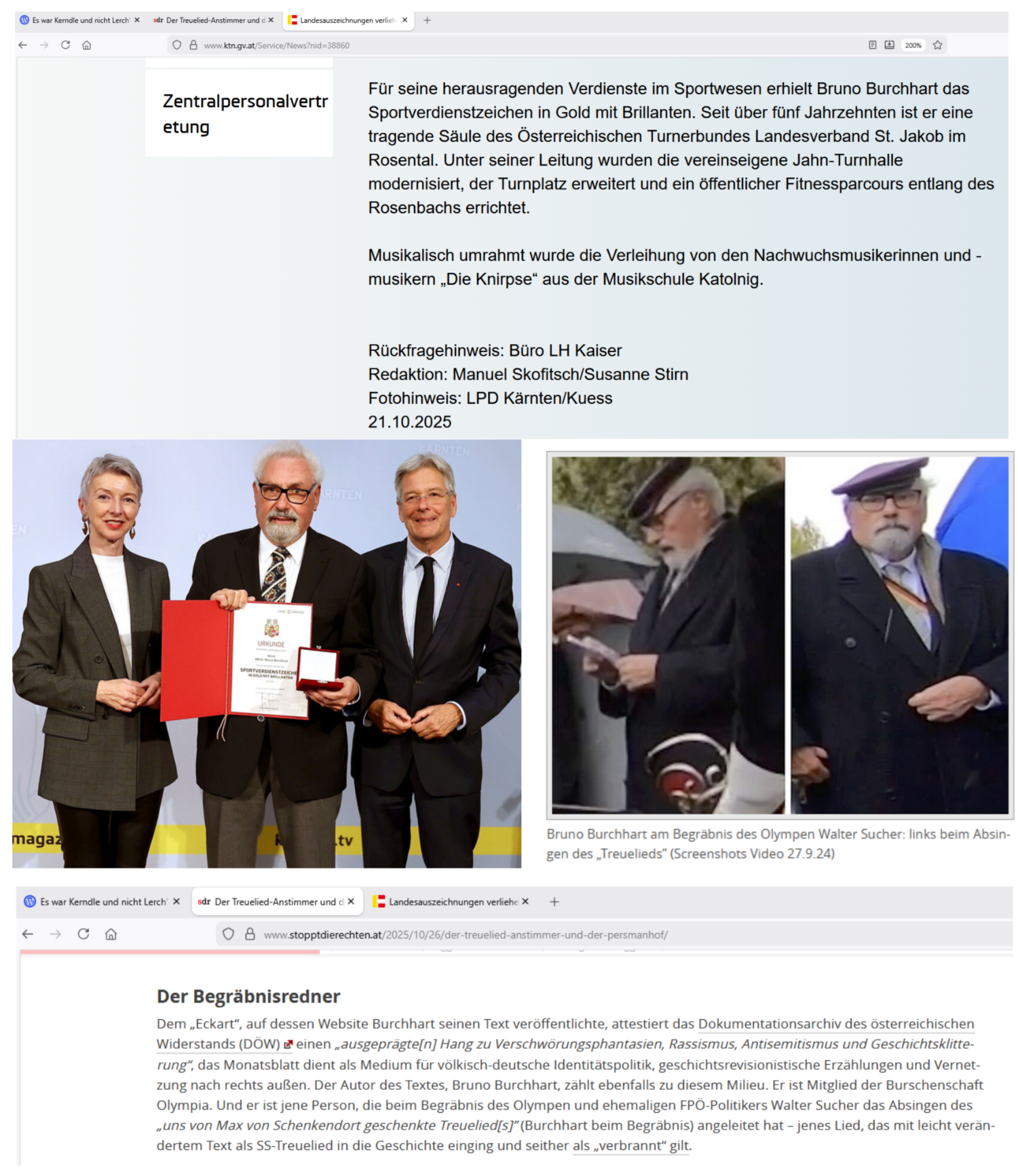 Der Begräbnisredner Dem „Eckart“, auf dessen Website Burchhart seinen Text veröffentlichte, attestiert das Dokumentationsarchiv des österreichischen Widerstands (DÖW) einen „ausgeprägte[n] Hang zu Verschwörungsphantasien, Rassismus, Antisemitismus und Geschichtsklitterung“, das Monatsblatt dient als Medium für völkisch-deutsche Identitätspolitik, geschichtsrevisionistische Erzählungen und Vernetzung nach rechts außen. Der Autor des Textes, Bruno Burchhart, zählt ebenfalls zu diesem Milieu. Er ist Mitglied der Burschenschaft Olympia. Und er ist jene Person, die beim Begräbnis des Olympen und ehemaligen FPÖ-Politikers Walter Sucher das Absingen des „uns von Max von Schenkendort geschenkte Treuelied[s]” (Burchhart beim Begräbnis) angeleitet hat – jenes Lied, das mit leicht verändertem Text als SS-Treuelied in die Geschichte einging und seither als „verbrannt“ gilt.