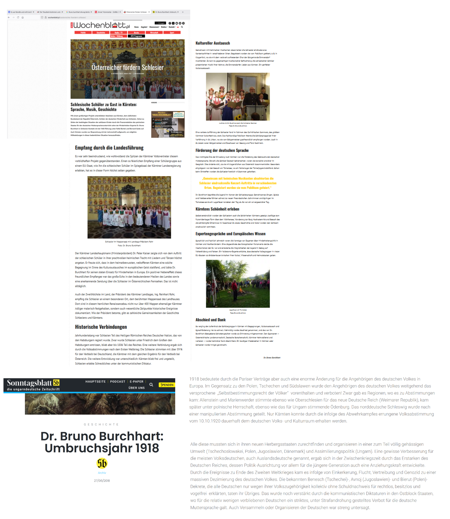 Der Kärntner Landeshauptmann (Ministerpräsident) Dr. Peter Kaiser zeigte sich von dem Auftritt der schlesischen Schüler in ihrer prachtvollen heimischen Tracht mit Liedern und Tänzen höchst angetan. Er freute sich, dass in dem heimatbewussten, weltoffenen Kärnten eine solche Begegnung im Sinne des Kulturaustausches im europäischen Geist stattfand, und lobte Dr. Burchhart für seinen steten Einsatz für Minderheiten in Europa. Ein positiver Nebeneffekt dieses freundlichen Empfanges war das große Echo in den bedeutenderen Medien des Landes sowie eine anerkennende Sendung über die Schlesier im Österreichischen Fernsehen. Das ist nicht alltäglich.