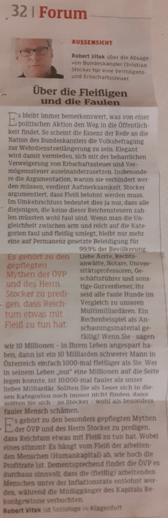 [w]enn man die Ungleichheit zwischen arm und reich auf die Kategorien faul und fleißig umlegt, bleibt nur mehr eine auf Permanenz gesetzte Beleidigung für 99,9 % der Bevölkerung[,]