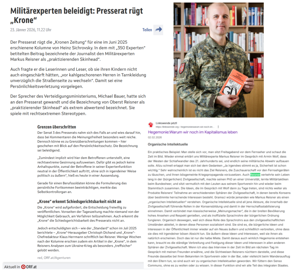 Der Presserat rügt die „Kronen Zeitung“ für eine im Juni 2025 erschienene Kolumne von Heinz Sichrovsky. In dem mit „350 Experten“ betitelten Beitrag bezeichnete der Journalist den Militärexperten Markus Reisner als […].