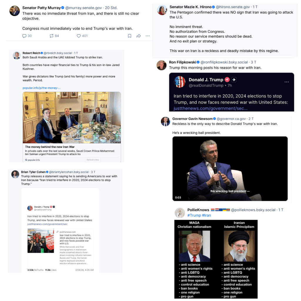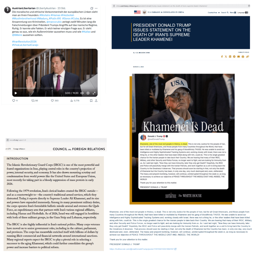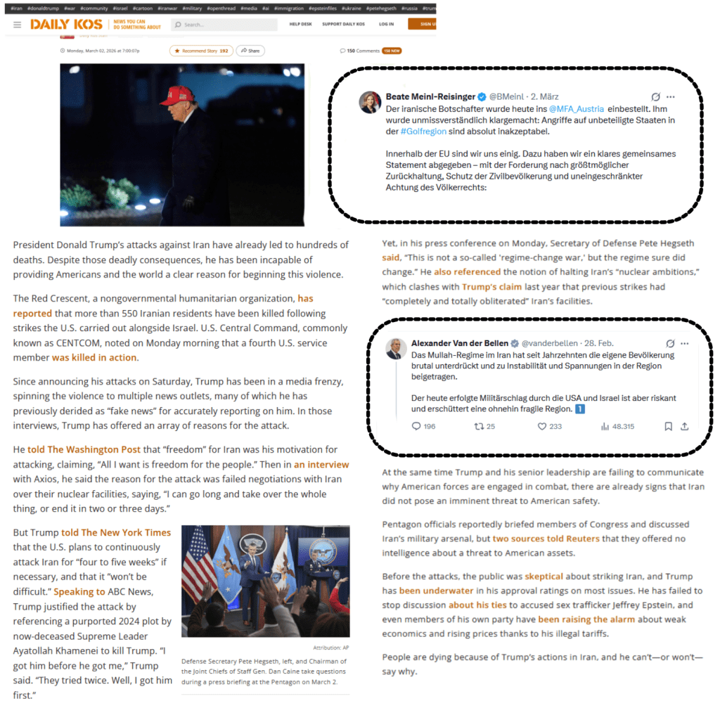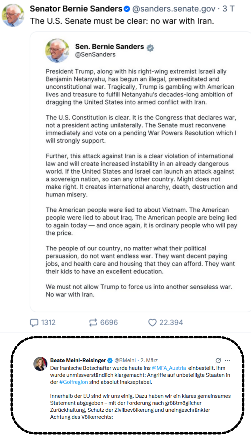 Bevor noch mehr in Österreich, auch in Österreich, der Trumpmania verfallen, sollten doch stellvertretend ein paar aus den Stimmen aus den Vereinigten Staaten seit dem 28. Februar 2026 selbst gehört werden, auch die des Donald Trump, die vielleicht dazu beitragen könnten, daß in Österreich, auch in Österreich, wenigstens ein wenig weiter, wenigstens ein wenig umfassender betrachtet und beurteilt wird, was nun wieder auf trumpische Art diesmal mit dem Iran passiert, wenigstens ein wenig die neuerlichen und mit Bestimmtheit nicht letzten trumpischen Gesetzesbrüche auch berücksichtigt werden, und nicht nur bis dahin weiter gehudelt und zu oft schon lobgehudelt wird, wer kann jetzt in Preisung von Donald Trump mehr anschwärzen, mehr diffamieren, mehr heruntermachen und so weiter und so fort.