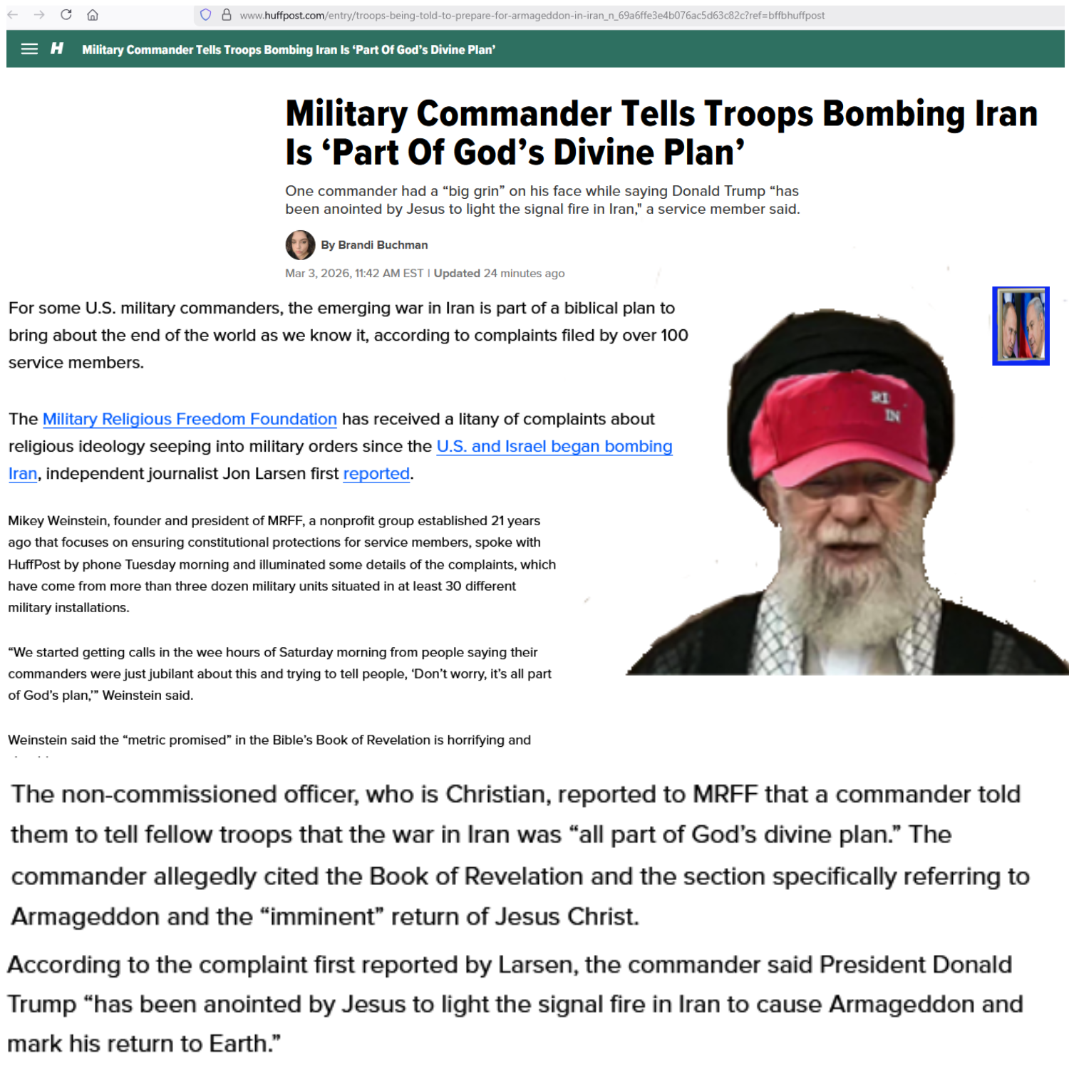 The non-commissioned officer, who is Christian, reported to MRFF that a commander told them to tell fellow troops that the war in Iran was “all part of God’s divine plan.” The commander allegedly cited the Book of Revelation and the section specifically referring to Armageddon and the “imminent” return of Jesus Christ.