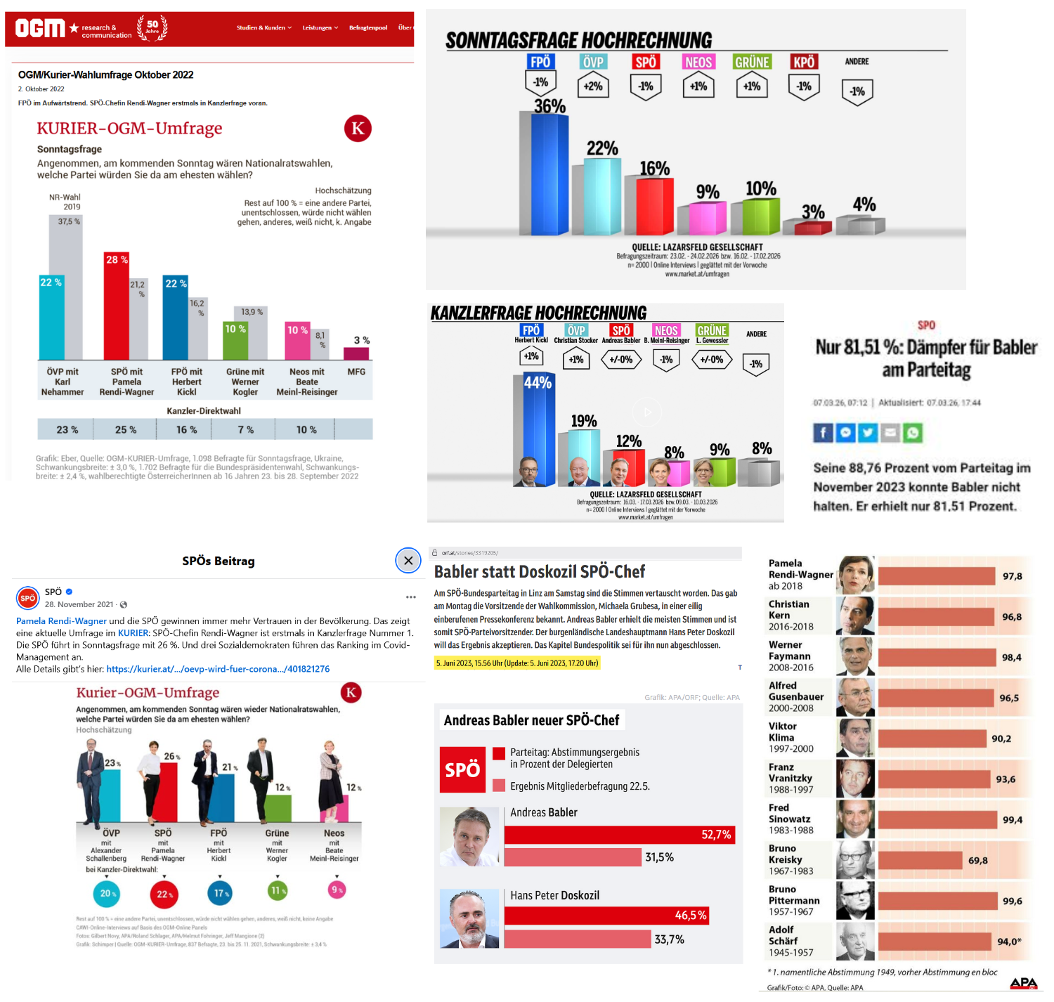 Menschgemäß können nicht alle Umfrageergebnisse aus der Zeit des Parteivorsitzes von Pamela Rendi-Wagner angeführt werden, auch nicht alle aus der bisherigen Zeit des Parteivorsitzes von Andreas Babler gelistet werden. Aber als Momentaufnahme und das scheint passend, sind doch Umfragen über deren grundsätzliche Fragwürdigkeit hinaus nichts anderes als Momentaufnahmen, eine Umfragemomentaufnahme aus der Zeit des Parteivorsitzes von Pamela Rendi-Wagner: