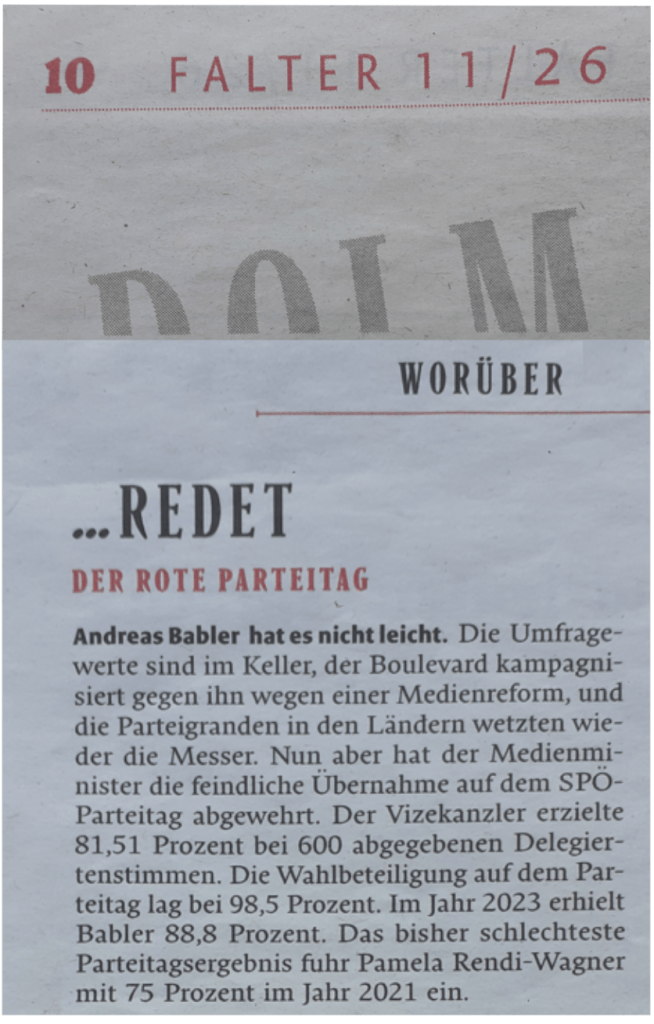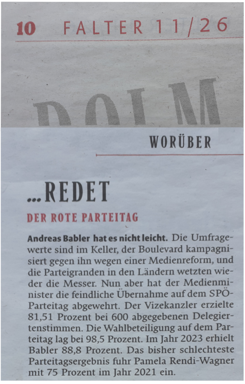 So — Das bisher schlechteste Parteitagsergebnis fuhr Andreas Babler mit 52,7 Prozent im Jahr 2023 ein. — könnte über das „Parteitagsergebnis“ im Jahr 2026 geschrieben werden, wenn es ebenso beschrieben werden würde, wie „Falter“ darüber „redet“, nicht gehört, aber gelesen in der Ausgabe 11/26, also derart ungenau, wobei sich die Frage stellt, ist es schlicht ungenau, ist es einfach fehlendes historisches Wissen oder ist diese eingesetzte Ungenauigkeit, dieses vorgegebene historische Fehlwissen ein Mittel zum Zweck?