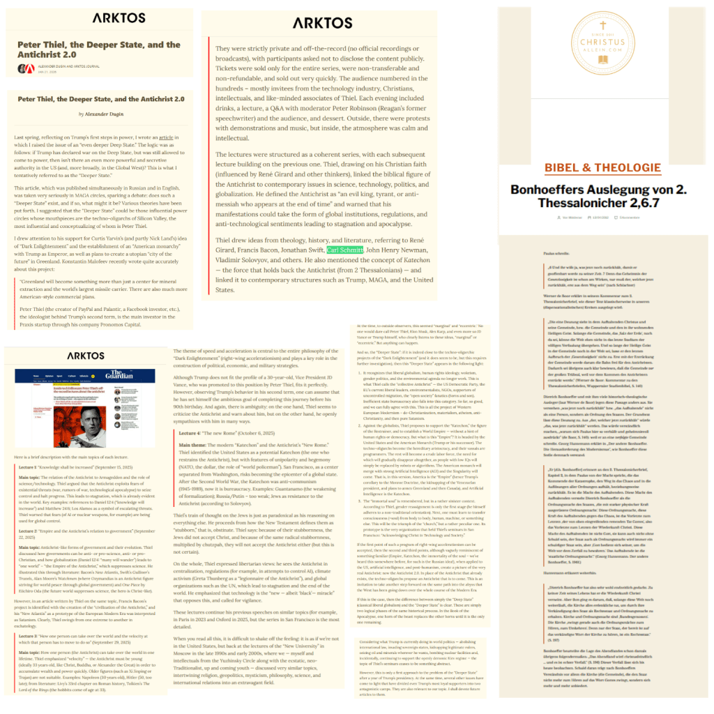 schrieb und was Alexander Dugin schreibt und was Peter Thiel redet, auch zu Katechon, dazu gibt es weitere Auslegungen, etwa von Dietrich Bonhoeffer —