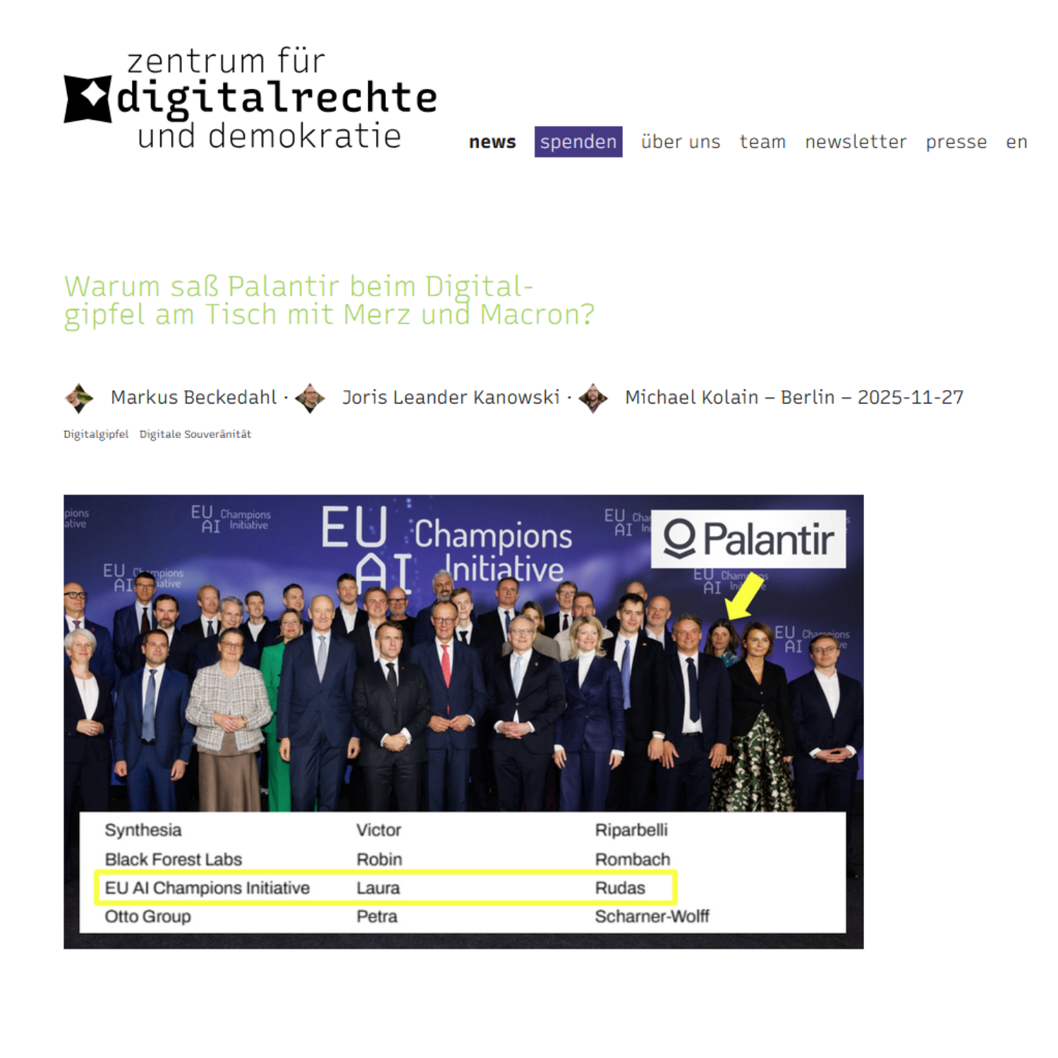 Beim „Gipfel zur Europäischen Digitalen Souveränität“ saß ausgerechnet eine hochrangige Mitarbeiterin des umstrittenen Unternehmens Palantir mit am Tisch. Laura Rudas war Teil eines sogenannten Round Tables der „EU AI Champions Initiative“. Allerdings war sie dort nicht als leitende Mitarbeiterin von Palantir gelistet, sondern vertrat offiziell ebenjene Initiative. Das hat das Zentrum für Digitalrechte und Demokratie in einer Recherche herausgefunden.