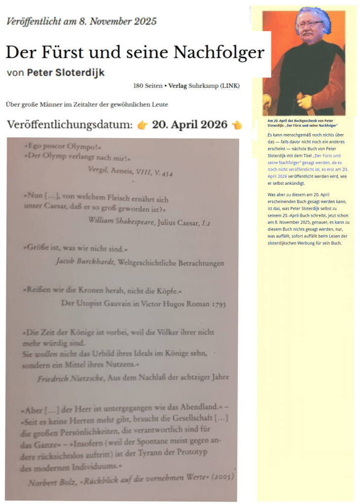 und das bereits scheinbar seit ein, zwei oder drei Wochen, wie es am 12. April 2026 in einer Buchhandlung unerwartet zu sehen war, und das entgegen der Ankündigung von Peter Sloterdijk für sein Buch „Der Fürst und seine Erben/Über große Männer im Zeitalter der gewöhnlichen Leute“ höchstselbst: „Veröffentlichungsdatum 20. April 2026“ —