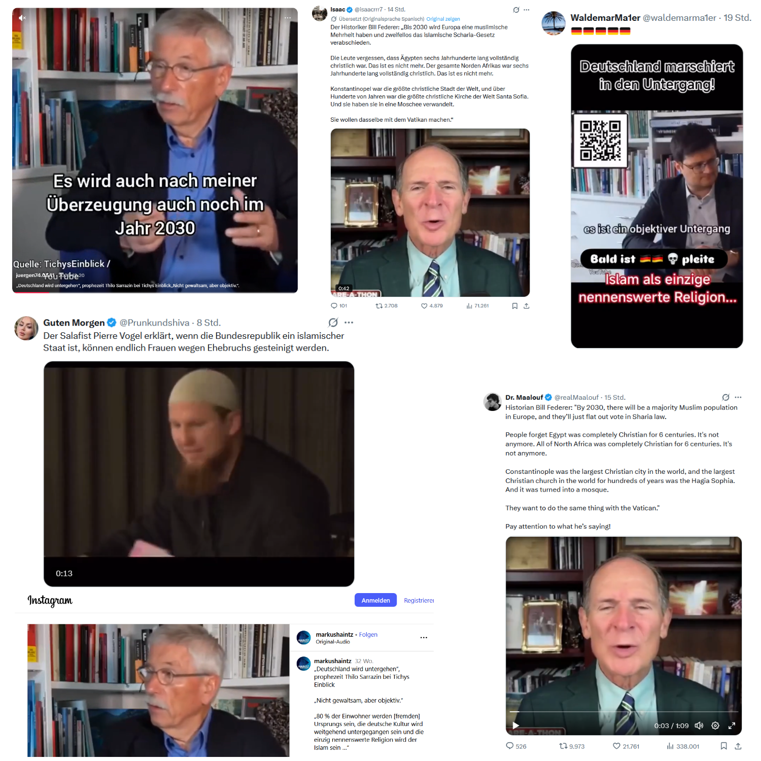 Der Historiker Bill Federer: „Bis 2030 wird Europa eine muslimische Mehrheit haben und zweifellos das islamische Scharia-Gesetz verabschieden. Die Leute vergessen, dass Ägypten sechs Jahrhunderte lang vollständig christlich war. Das ist es nicht mehr. Der gesamte Norden Afrikas war sechs Jahrhunderte lang vollständig christlich. Das ist es nicht mehr. Konstantinopel war die größte christliche Stadt der Welt, und über Hunderte von Jahren war die größte christliche Kirche der Welt Santa Sofia. Und sie haben sie in eine Moschee verwandelt. Sie wollen dasselbe mit dem Vatikan machen.“