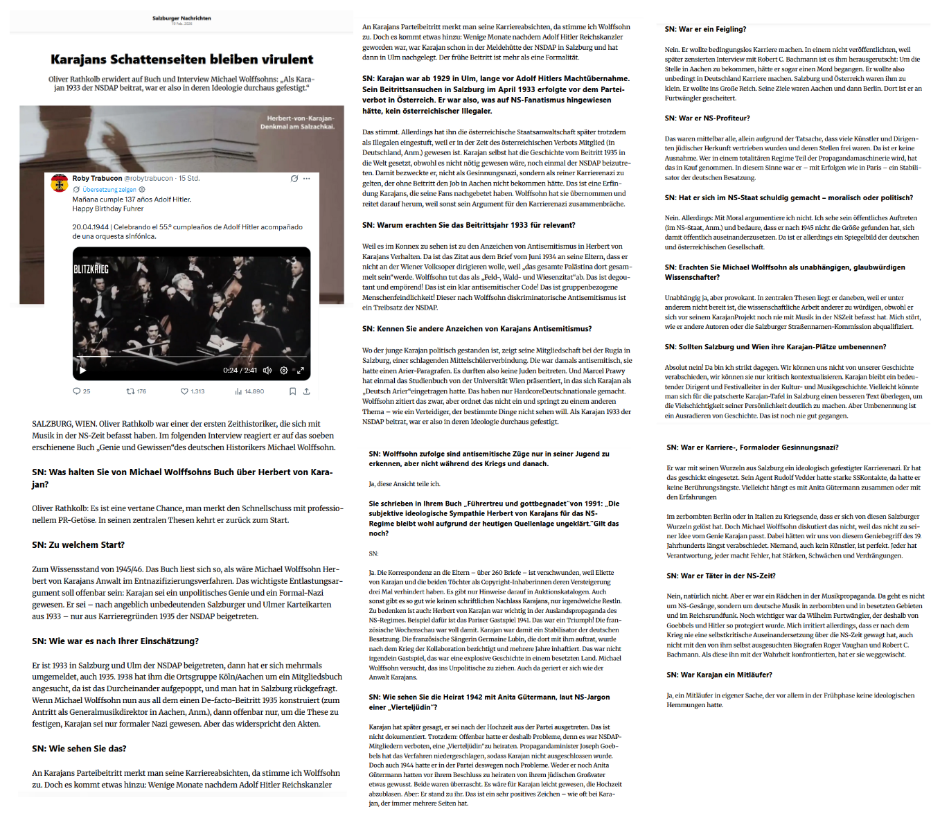 Unabhängig ja, aber provokant. In zentralen Thesen liegt er [Wolffsohn] daneben, weil er unter anderem nicht bereit ist, die wissenschaftliche Arbeit anderer zu würdigen, obwohl er sich vor seinem KarajanProjekt noch nie mit Musik in der NSZeit befasst hat. Mich stört, wie er andere Autoren oder die Salzburger Straßennamen-Kommission abqualifiziert.