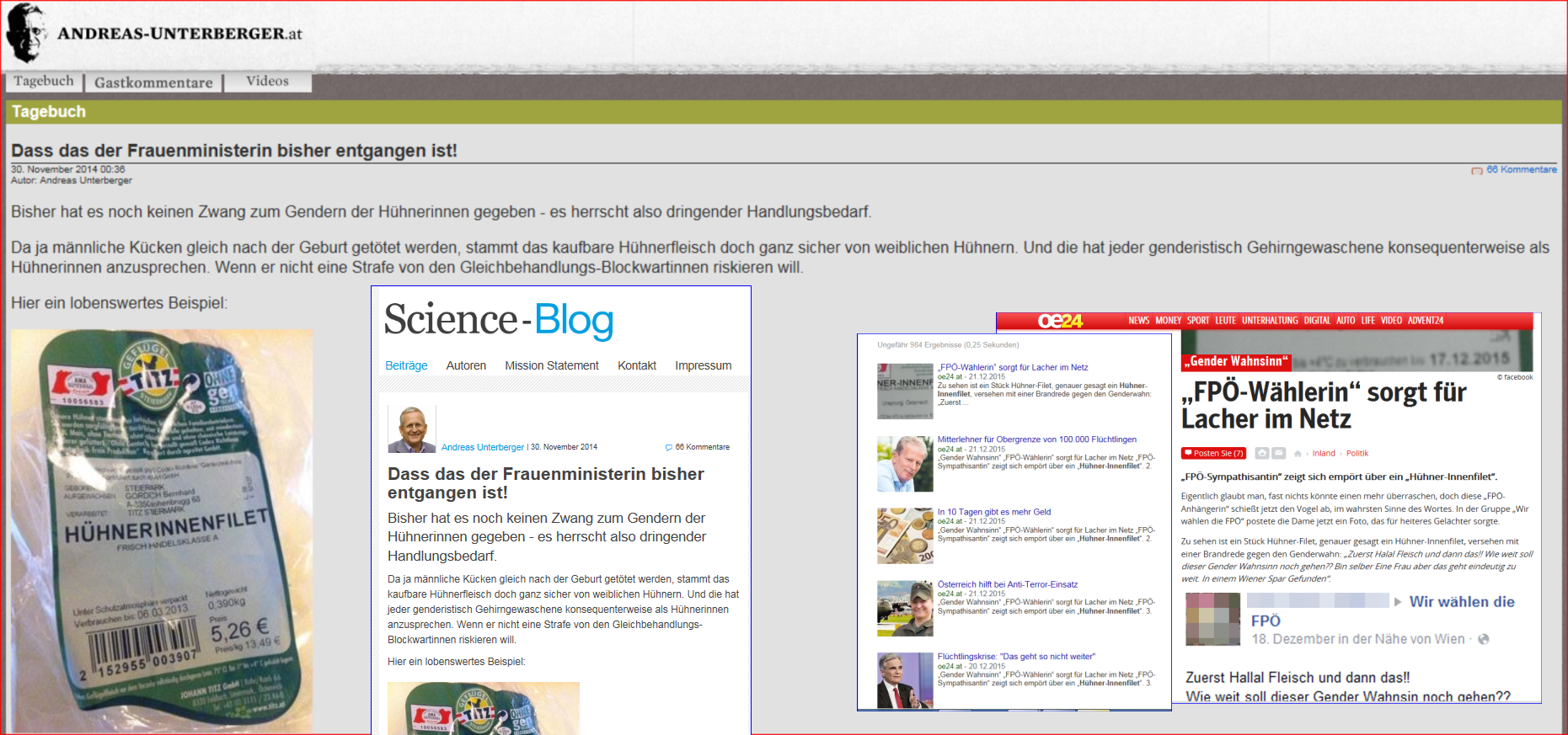 Andreas Unterberger, der bereits im November 2014 darüber … wie in der Collage gelesen werden kann. Und weil Andreas Unterberger eine besonders kluge Henne ist, er auch eine von seiner Klugheit überzeugte Henne ist, hat er es gleich zweimal veröffentlichen müssen, und mit Neid muß er jetzt wohl gelesen haben, die Aufmerksamkeit dafür aber bekam das Ei …