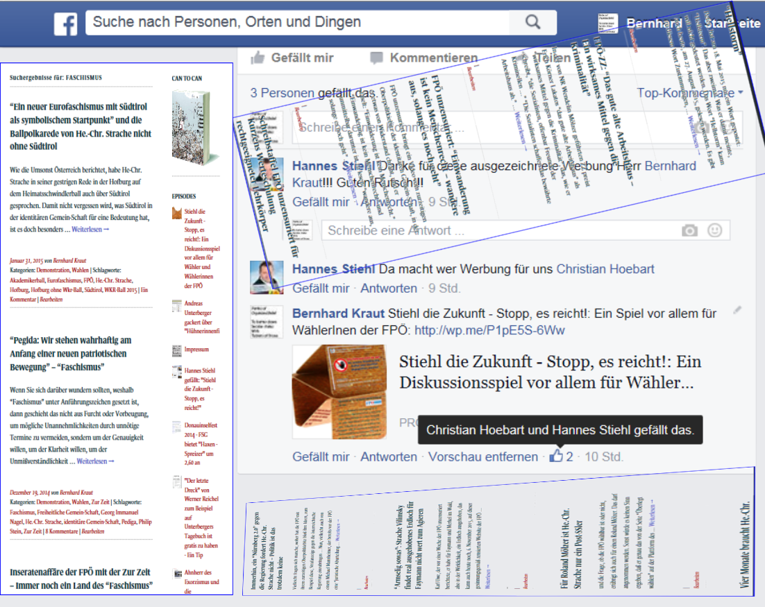 Das Politspiel gefällt innerhalb weniger Stunden bereits einem zweiten Funktionär der FPÖ, wie in der Collage gelesen werden kann. Und weil NR Christian Höbart nebenher auch Abgeordneter im österreichischen Parlament ist, wäre das Parlament ein ebenfalls sehr geeigneter Ort, um dieses Spiel auch dort zu spielen, nicht nur in Wirthäusern von Breitenfurt, Kaltenleutgeben, von …