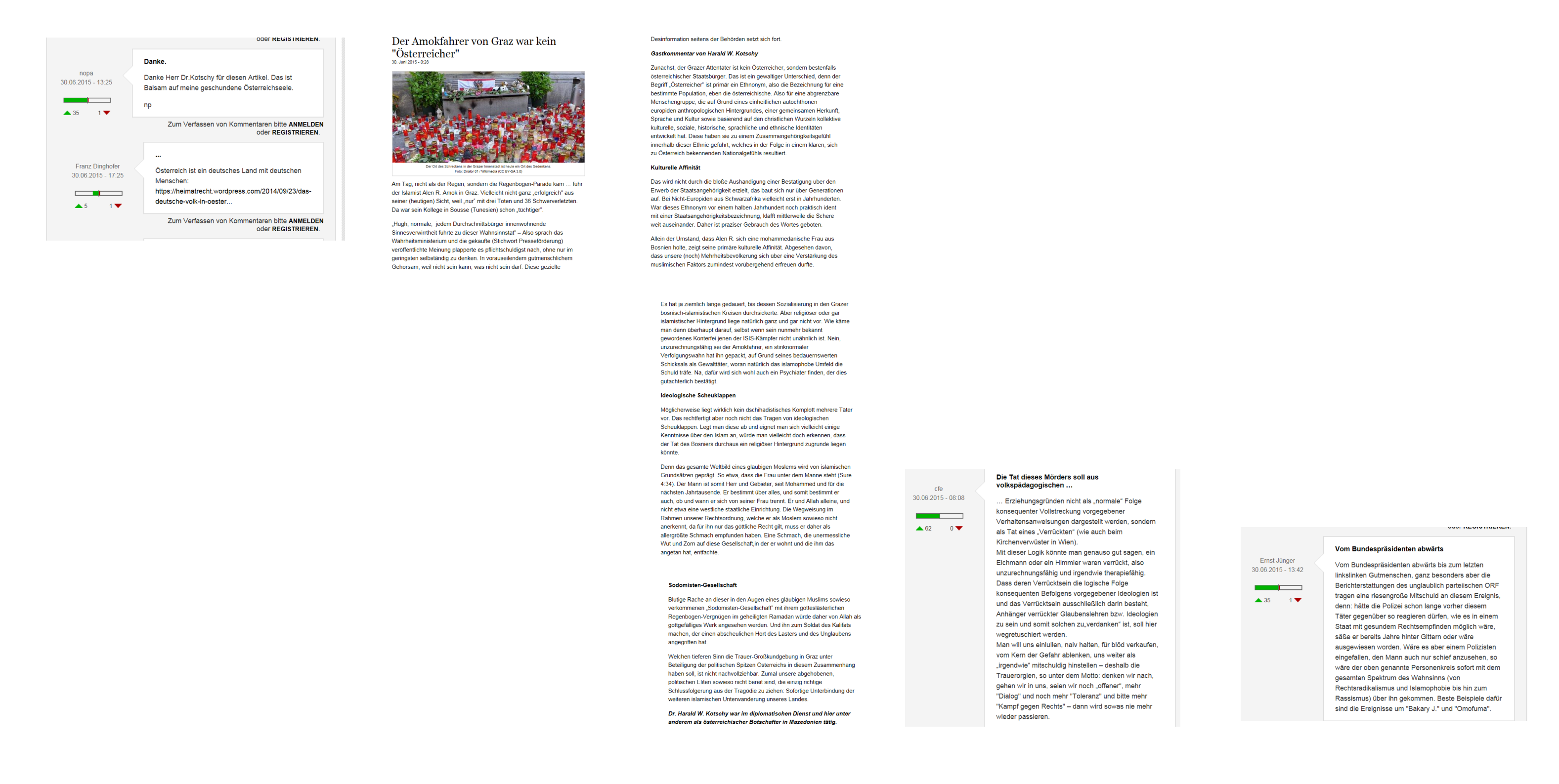 Ein ehemaliger Diplomat, wie er auf der gesinnungsgemäß zensierten Website der identitären Gemein-Schaft vorgestellt wird, mit Namen Dr. Harald W. Kotschy, versucht am 30. Juni 2015 die Amokfahrt in Graz als das darzustellen, mit dem der zurzeitige Obmann dieser Gemein-Schaft bereits kläglich gescheitert ist. Es ist wohl auch der Versuch, seinen Anführer zu rehabilitieren, freilich mit derart aberwitzigen Wendungen, auf die nicht einmal eingegangen zu werden braucht.