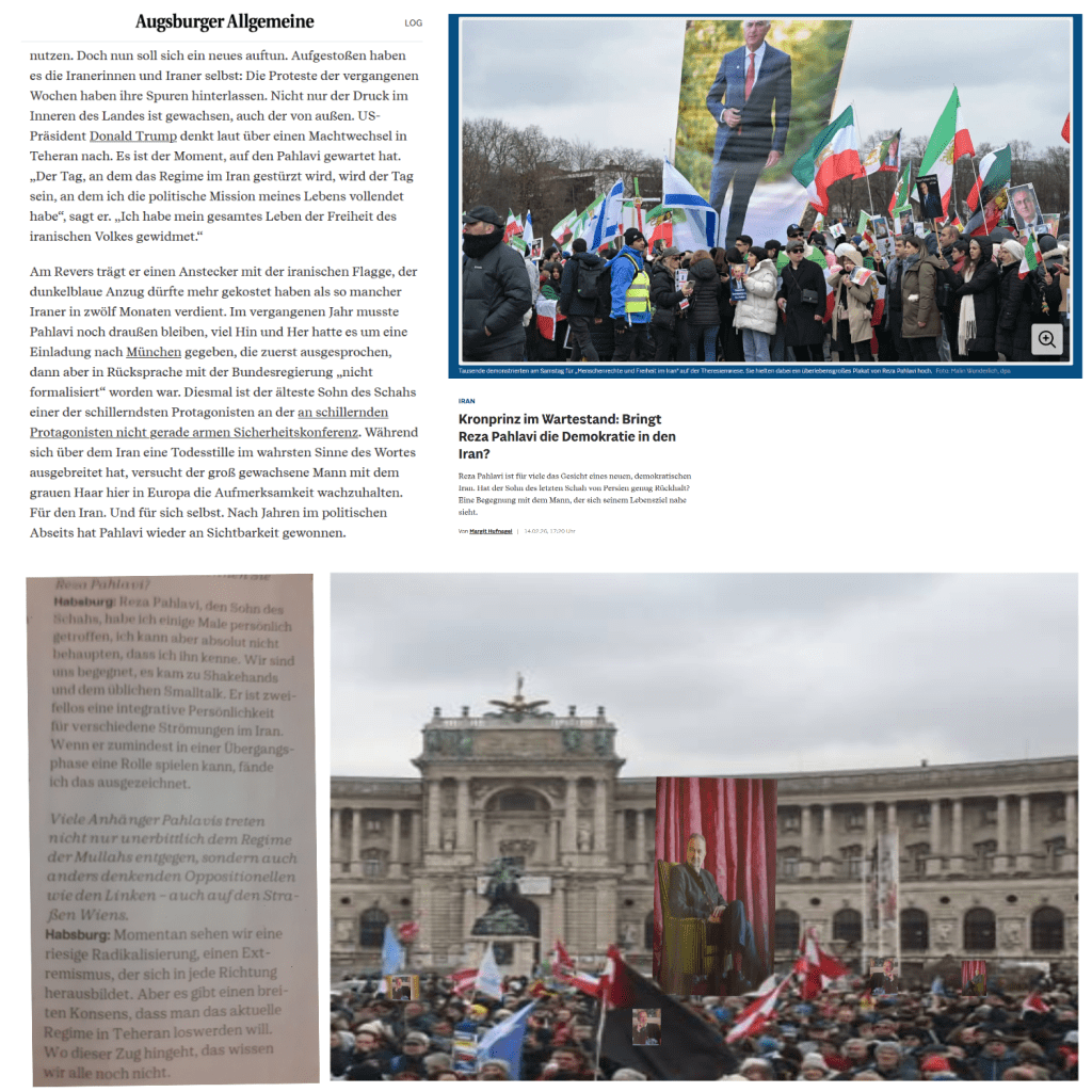 Ja, „auch auf den Straßen Wiens“ wird demonstriert, wer denn der bessere Demokrat ist, etwa „Anhänger Pahlavis, der für „SKKH Karl“ „zweifellos eine integrative Persönlichkeit“ —
