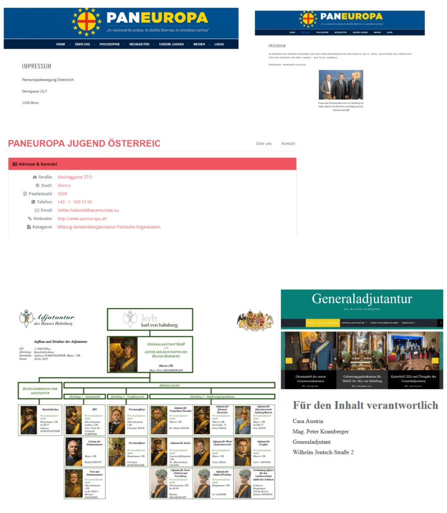 Bloß auch nebenher, gemäß Impressum ist „Paneuropa“, dessen Ehrenpräsident „SKKH Karl“, ebenfalls in der Steingasse 25, und auf welche herrliche Kunst die „Paneuropa Jugend“ von der Neulinggasse 37 aus zu schauen gesegnet ist, davon wurde schon erzählt, im Zusammenhang mit „SKKH Karl“, der gemäß seiner vom Höchsten gegebenen Stellung eine Generaladjuntatur bedarf, und für jeden Mann in diesem Lande es wohl die höchste Ehre wäre, die Position „Generaladjuntat SKKH“ …