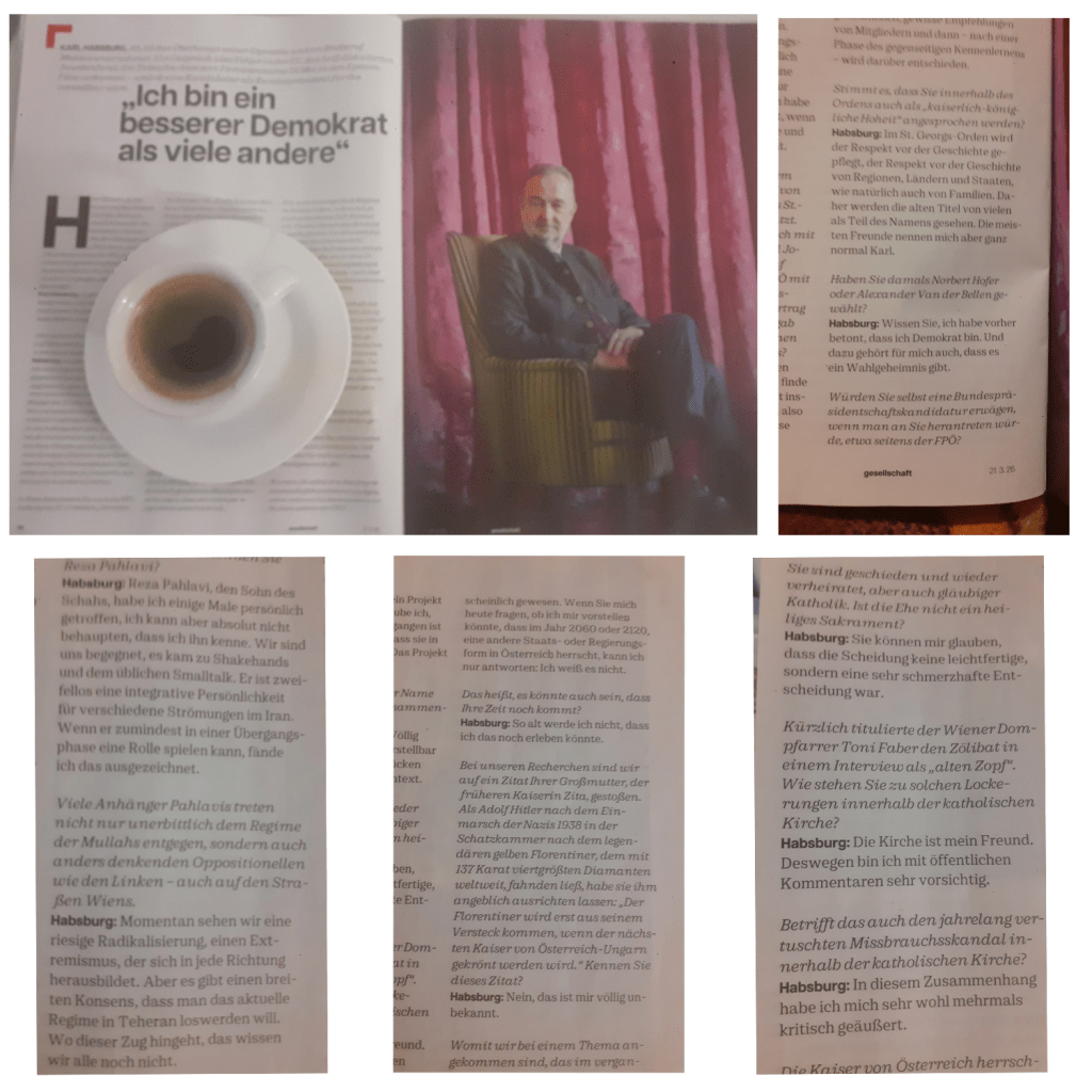 Ein Blick auf die Website von Karl Habsburg hätte genügt, um ihn zu fragen, weshalb er sich selbst nach wie vor, am 22. März 2026 wieder einmal gelesen, als „SKKH Karl von Habsburg“ bezeichnet, stattdessen aber fragen Nina Brnada, Angelika Hager in der „Profil“-Ausgabe 12 vom 21. März 2026 ob