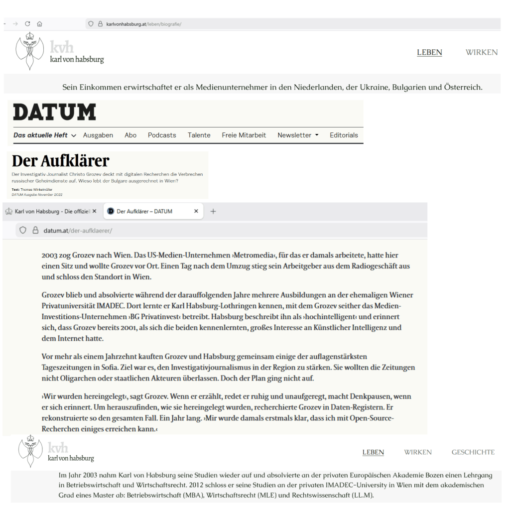 Vor mehr als einem Jahrzehnt kauften Grozev und Habsburg gemeinsam einige der auflagenstärksten Tageszeitungen in Sofia. Ziel war es, den Investigativjournalismus in der Region zu stärken. Sie wollten die Zeitungen nicht Oligarchen oder staatlichen Akteuren überlassen. Doch der Plan ging nicht auf. ›Wir wurden hereingelegt‹, sagt Grozev.