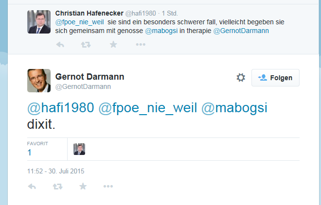 NS Es zahlt sich nicht aus, dafür eine neue Seite aufzuschlagen, aber die Reaktion von NR Hafenecker darauf, was hier oben geschrieben wurde, ist bereits da, und soll nicht vorenthalten werden. Er reagiert, wie eben ein freiheitlicher NR nur reagieren kann, mit Unterstellungen. Schwerwiegend ist dabei die Unterstellung, ein „Genosse“ zu sein. Das muß entschieden zurückgewiesen werden. Eine „Therapie“ in Verbindung mit „schwerer fall“ zu empfehlen, ist eine Umschreibung für …