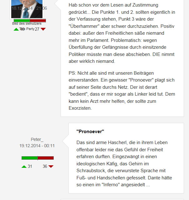 Das ist also nicht nur ein Unsinn, sondern es ist viel schlimmer. Es wird jetzt darauf reagiert, weil eben die Wahlen in Oberösterreich und in Wien vor der Tür stehen. Für die „herankeimenden“ Wahlkämpfe entdecken nun Dritte beispielsweise sogar einen „Peter_“ es, und das Schlimme wird sein, nach den Wahlkämpfen wird die Schreibstaffel der FPÖ-Unzensuriert wieder unbehelligt ihren blutrünstigen Alltag ausleben können, breit ignoriert von Medien und anderen Parteien, allen voran von ÖVP und SPÖ.
